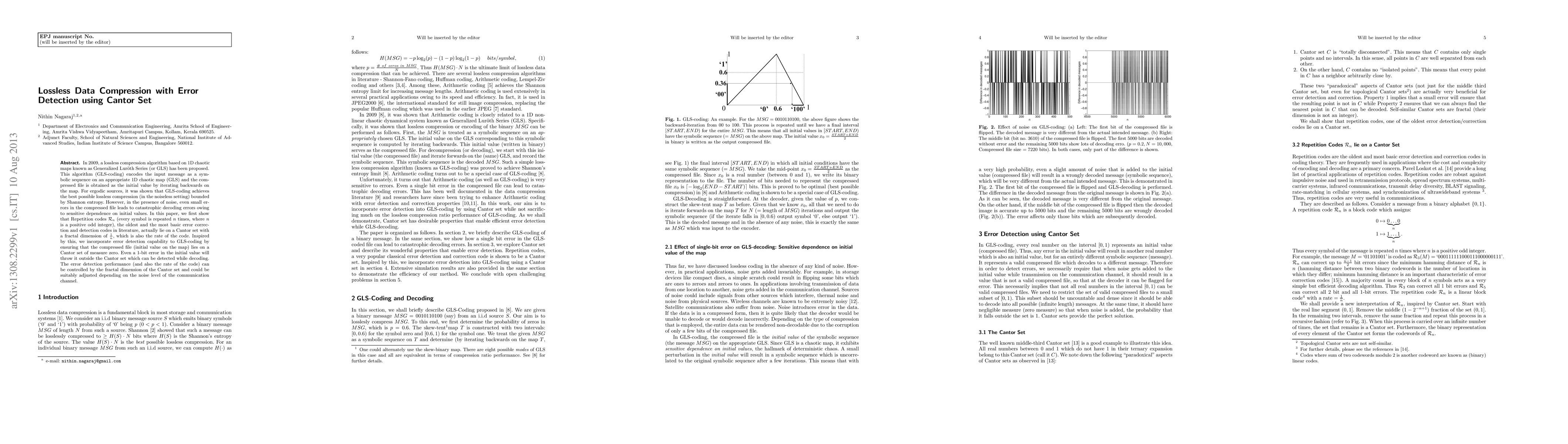 In 2009, a lossless compression algorithm based on 1D chaotic maps known as Generalized Lur\"{o}th Series (or GLS) has been proposed. This algorithm (GLS-coding) encodes the input message as a symbolic sequence on an appropriate 1D chaotic map (GLS) and the compressed file is obtained as the initial value by iterating backwards on the map. For ergodic sources, it was shown that GLS-coding achieves the best possible lossless compression (in the noiseless setting) bounded by Shannon entropy. However, in the presence of noise, even small errors in the compressed file leads to catastrophic decoding errors owing to sensitive dependence on initial values. In this paper, we first show that Repetition codes $\mathcal{R}_n$ (every symbol is repeated $n$ times, where $n$ is a positive odd integer), the oldest and the most basic error correction and detection codes in literature, actually lie on a Cantor set with a fractal dimension of $\frac{1}{n}$, which is also the rate of the code. Inspired by this, we incorporate error detection capability to GLS-coding by ensuring that the compressed file (initial value on the map) lies on a Cantor set of measure zero. Even a 1-bit error in the initial value will throw it outside the Cantor set which can be detected while decoding. The error detection performance (and also the rate of the code) can be controlled by the fractal dimension of the Cantor set and could be suitably adjusted depending on the noise level of the communication channel.