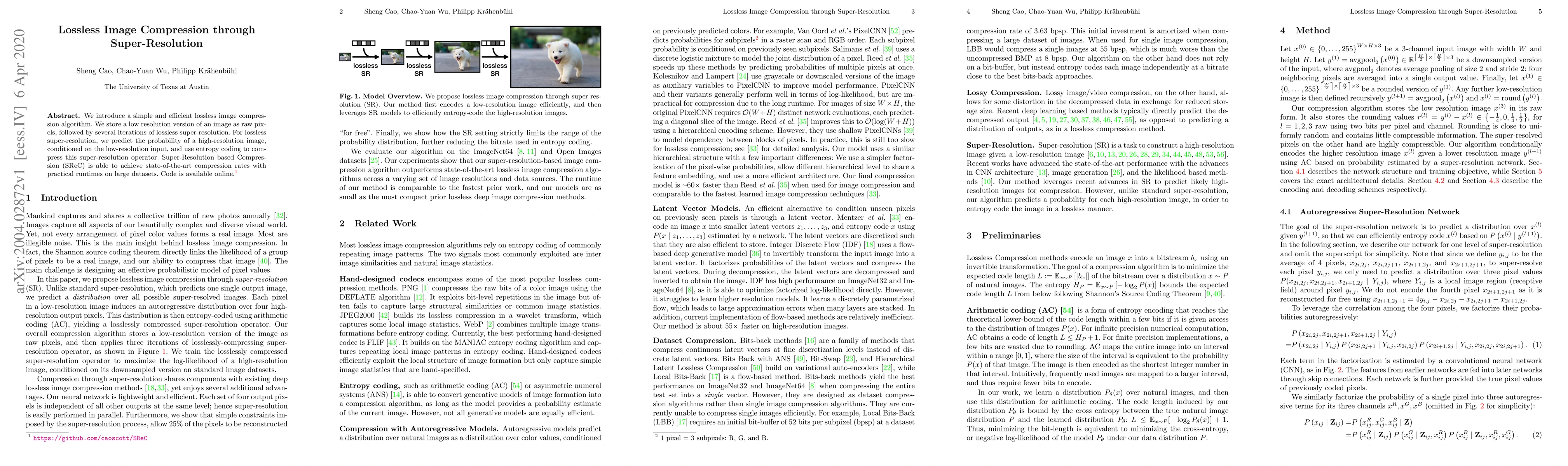 This paper presents a lossless image compression method using super-resolution, where a low-resolution image is iteratively enhanced and compressed through entropy coding of the super-resolution operator, achieving state-of-the-art compression rates with practical runtimes. Code for the proposed Super-Resolution based Compression (SReC) algorithm is available online.