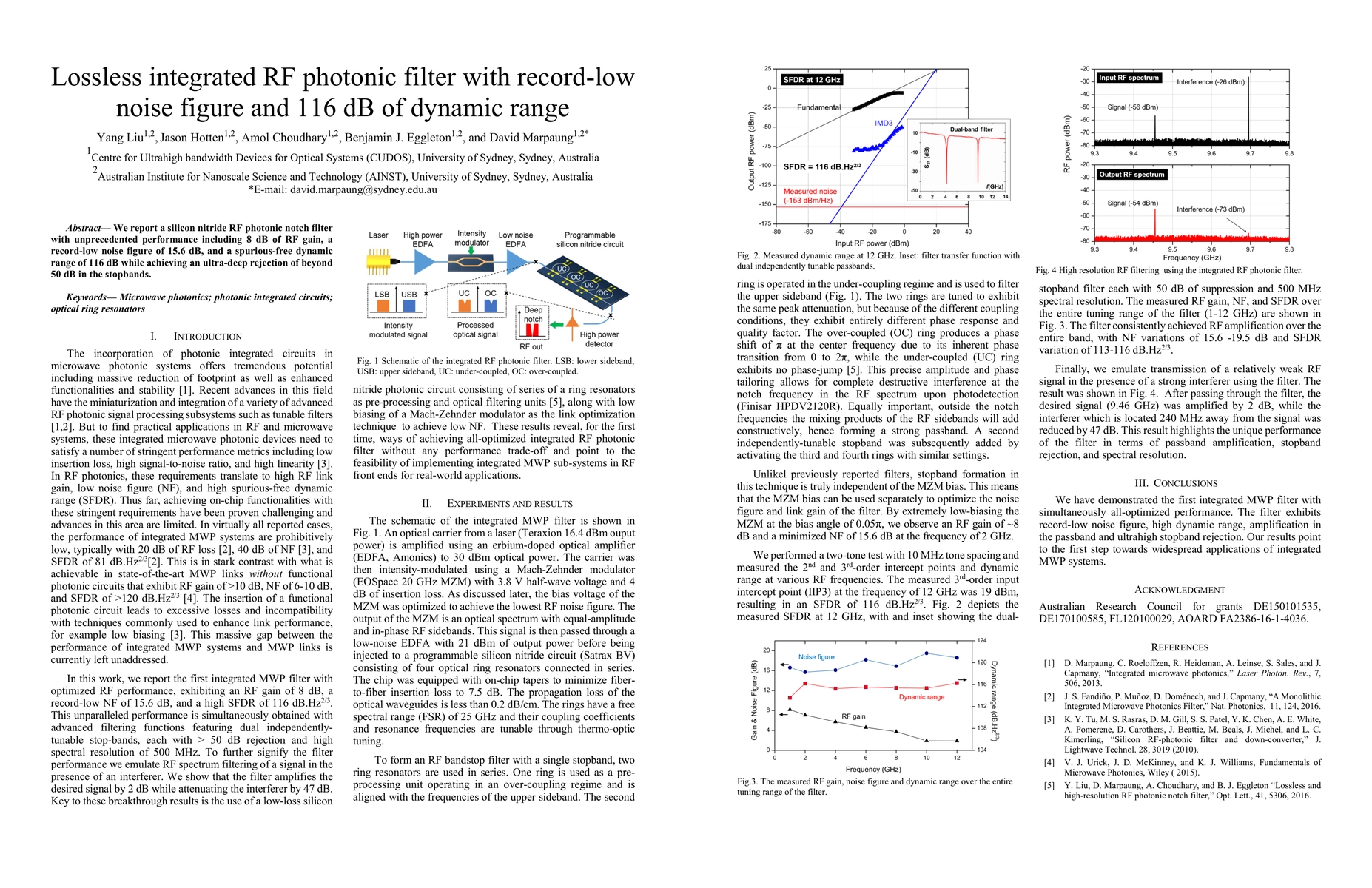 Researchers have developed a silicon nitride RF photonic notch filter that achieves record-low noise figure and ultra-deep rejection in stopbands, with performance exceeding 8 dB of RF gain and 116 dB of dynamic range.