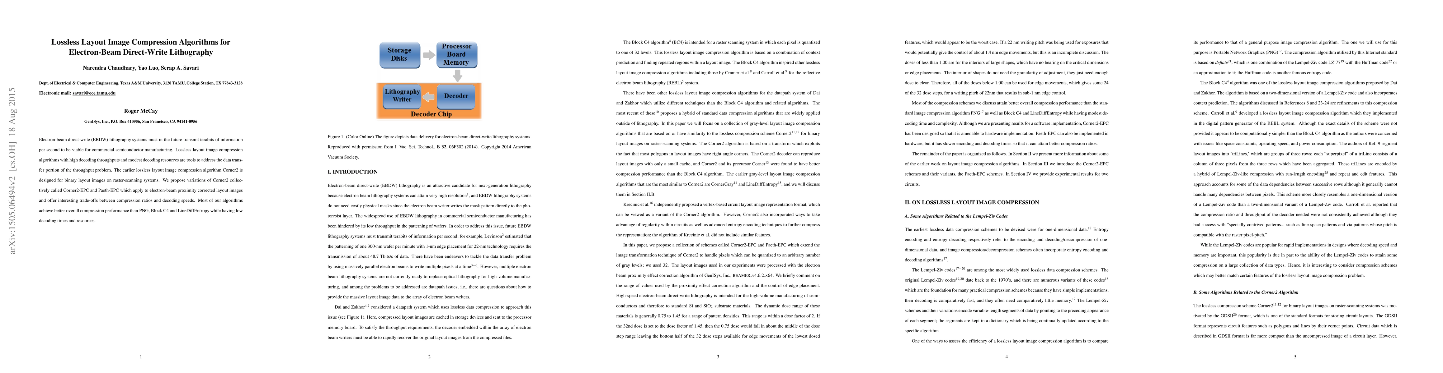 This paper proposes enhanced lossless compression algorithms, Corner2-EPC and Paeth-EPC, for electron-beam direct-write lithography systems to improve data transfer rates. These algorithms outperform traditional methods like PNG, Block C4, and LineDiffEntropy, achieving better compression ratios with low decoding times and resource usage.