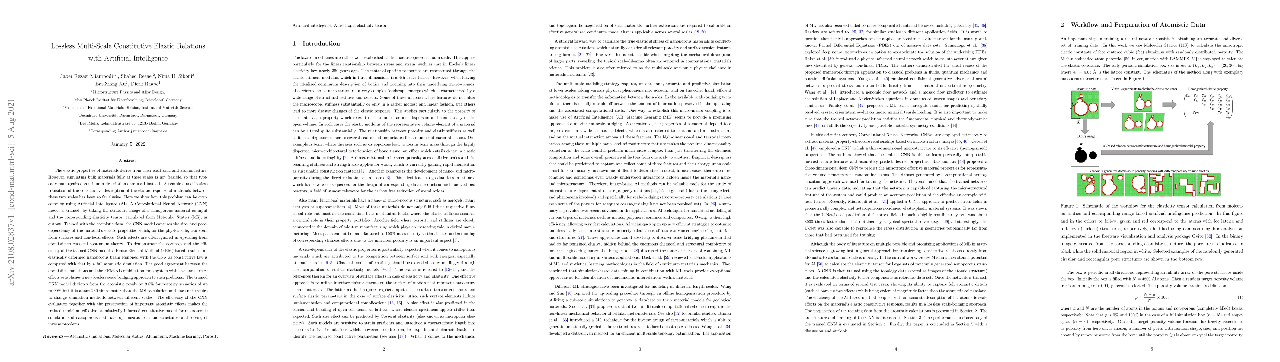 The elastic properties of materials derive from their electronic and atomic nature. However, simulating bulk materials fully at these scales is not feasible, so that typically homogenized continuum descriptions are used instead. A seamless and lossless transition of the constitutive description of the elastic response of materials between these two scales has been so far elusive. Here we show how this problem can be overcome by using Artificial Intelligence (AI). A Convolutional Neural Network (CNN) model is trained, by taking the structure image of a nanoporous material as input and the corresponding elasticity tensor, calculated from Molecular Statics (MS), as output. Trained with the atomistic data, the CNN model captures the size- and pore-dependency of the material's elastic properties which, on the physics side, can stem from surfaces and non-local effects. Such effects are often ignored in upscaling from atomistic to classical continuum theory. To demonstrate the accuracy and the efficiency of the trained CNN model, a Finite Element Method (FEM) based result of an elastically deformed nanoporous beam equipped with the CNN as constitutive law is compared with that by a full atomistic simulation. The good agreement between the atomistic simulations and the FEM-AI combination for a system with size and surface effects establishes a new lossless scale bridging approach to such problems. The trained CNN model deviates from the atomistic result by 9.6\% for porosity scenarios of up to 90\% but it is about 230 times faster than the MS calculation and does not require to change simulation methods between different scales. The efficiency of the CNN evaluation together with the preservation of important atomistic effects makes the trained model an effective atomistically-informed constitutive model for macroscopic simulations of nanoporous materials and solving of inverse problems.