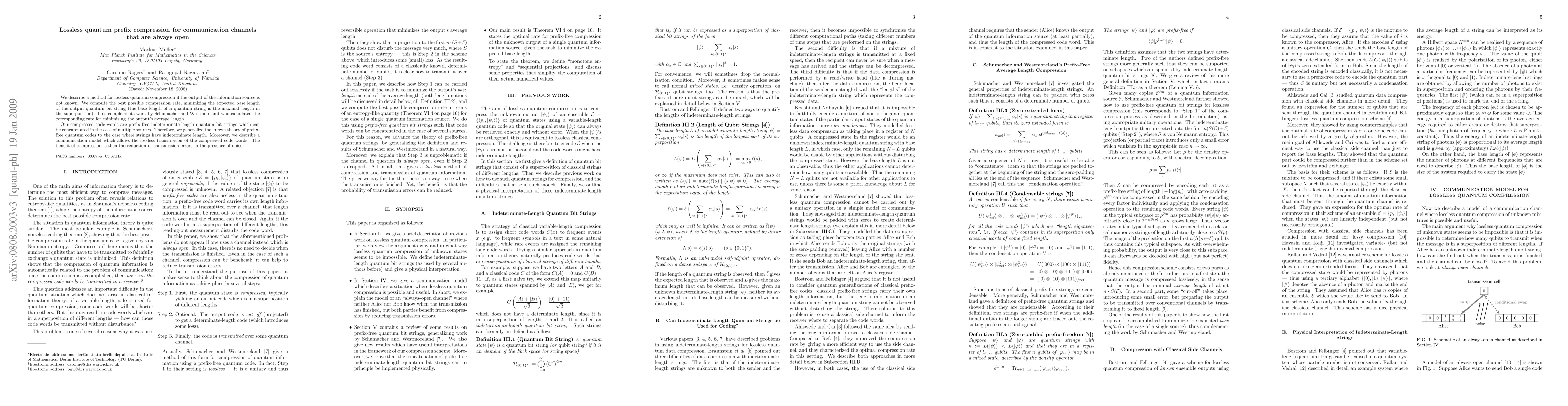 This paper presents a method for lossless quantum compression when the information source output is unknown, optimizing the base length of the output quantum bit string. It extends the theory of prefix-free quantum codes to indeterminate-length strings and introduces a communication model for their lossless transmission, reducing transmission errors in noisy channels.