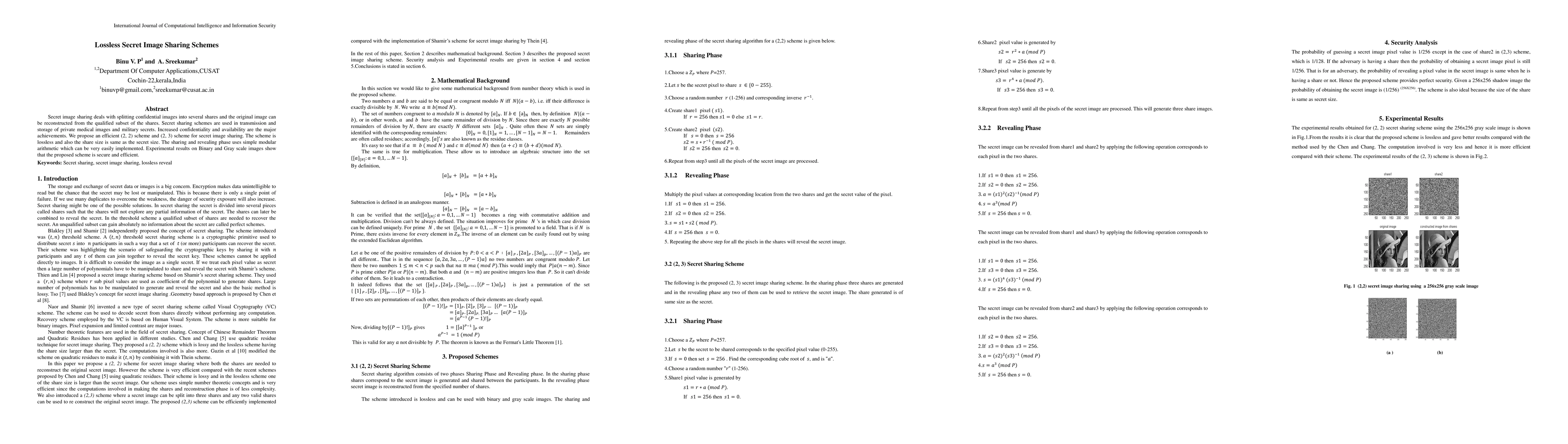 This paper proposes efficient lossless secret image sharing schemes (2, 2) and (2, 3) that split confidential images into shares, allowing reconstruction from qualified subsets. The schemes maintain share size equal to the secret size and utilize simple modular arithmetic for implementation, demonstrating security and efficiency in experiments on binary and grayscale images.