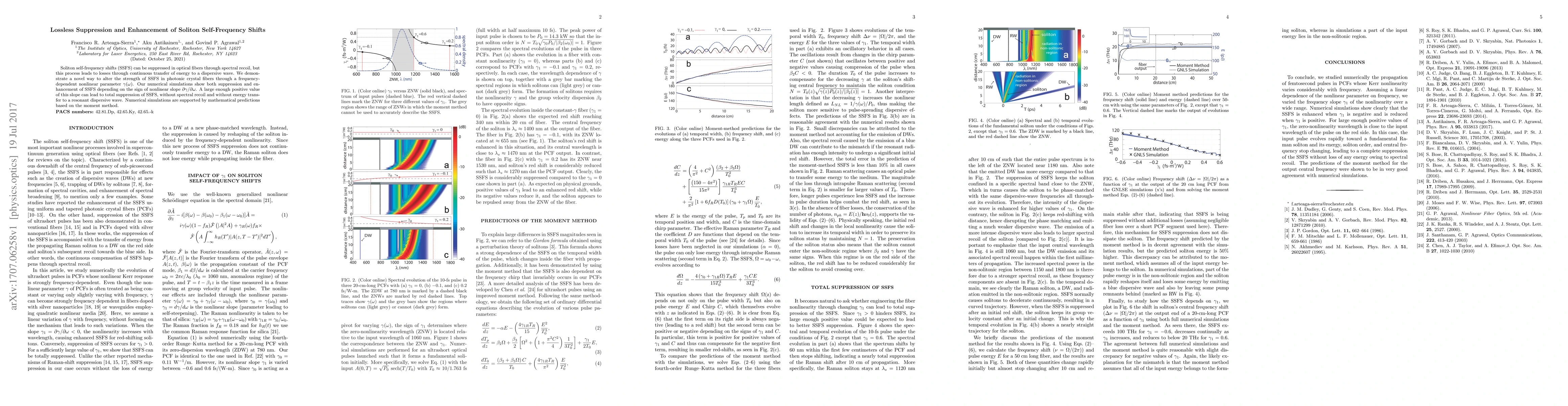 This paper presents a novel method to suppress and enhance soliton self-frequency shifts (SSFS) in optical fibers using a frequency-dependent nonlinear parameter $\gamma(\omega)$. The approach avoids losses by eliminating energy transfer to a dispersive wave, achieving total suppression of SSFS under certain conditions.