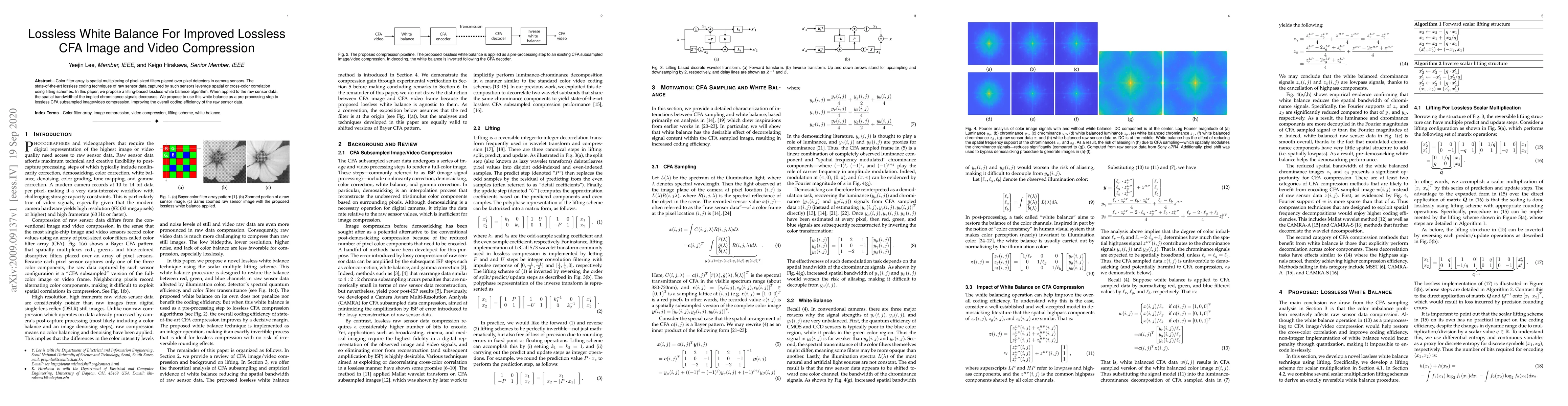 Color filter array is spatial multiplexing of pixel-sized filters placed over pixel detectors in camera sensors. The state-of-the-art lossless coding techniques of raw sensor data captured by such sensors leverage spatial or cross-color correlation using lifting schemes. In this paper, we propose a lifting-based lossless white balance algorithm. When applied to the raw sensor data, the spatial bandwidth of the implied chrominance signals decreases. We propose to use this white balance as a pre-processing step to lossless CFA subsampled image/video compression, improving the overall coding efficiency of the raw sensor data.