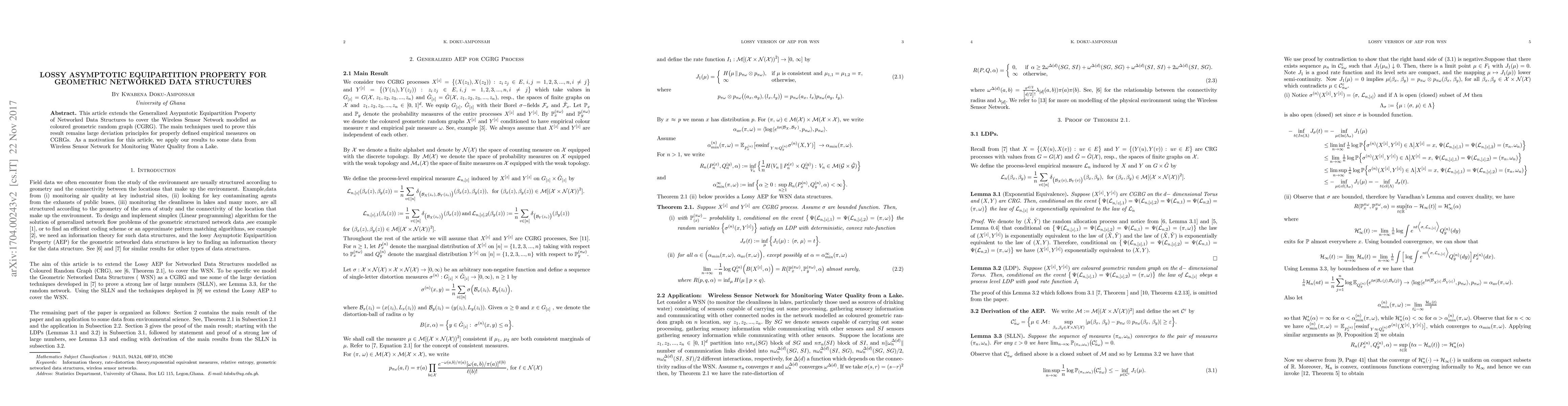 This paper extends the Generalized Asymptotic Equipartition Property to wireless sensor networks modeled as coloured geometric random graphs, using large deviation principles. The findings are demonstrated through an application to water quality monitoring data from a lake.