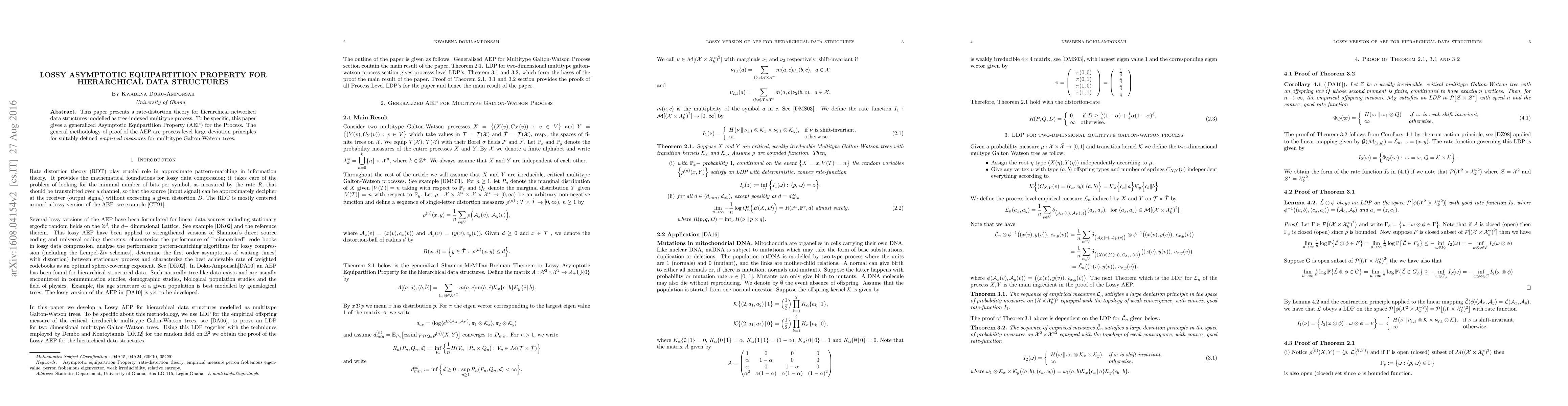 This paper develops a rate-distortion theory for hierarchical data structures modeled as tree-indexed multitype processes, presenting a generalized Asymptotic Equipartition Property (AEP) and employing large deviation principles for multitype Galton-Watson trees in its proof.