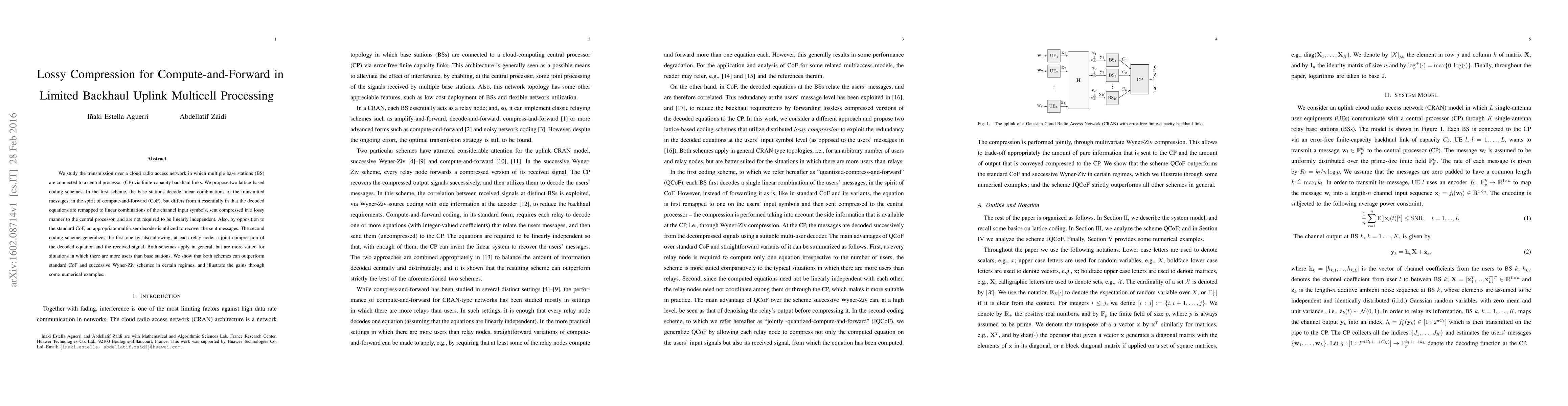 We study the transmission over a cloud radio access network in which multiple base stations (BS) are connected to a central processor (CP) via finite-capacity backhaul links. We propose two lattice-based coding schemes. In the first scheme, the base stations decode linear combinations of the transmitted messages, in the spirit of compute-and-forward (CoF), but differs from it essentially in that the decoded equations are remapped to linear combinations of the channel input symbols, sent compressed in a lossy manner to the central processor, and are not required to be linearly independent. Also, by opposition to the standard CoF, an appropriate multi-user decoder is utilized to recover the sent messages. The second coding scheme generalizes the first one by also allowing, at each relay node, a joint compression of the decoded equation and the received signal. Both schemes apply in general, but are more suited for situations in which there are more users than base stations. We show that both schemes can outperform standard CoF and successive Wyner-Ziv schemes in certain regimes, and illustrate the gains through some numerical examples.