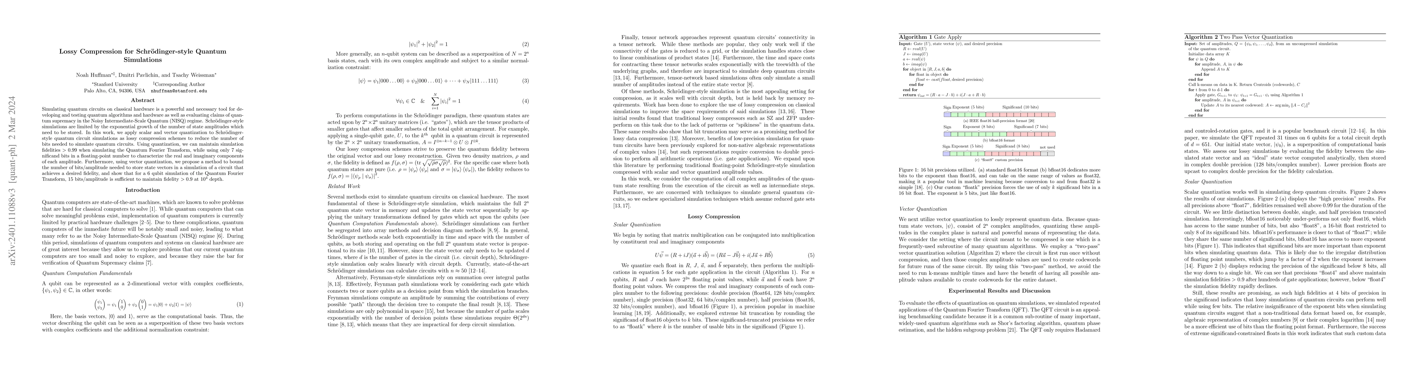 This paper explores the use of scalar and vector quantization for lossy compression in Schr\"odinger-style quantum simulations, demonstrating the ability to maintain fidelity above 0.99 using just 7 bits per amplitude, and achieving fidelity above 0.9 for 6 qubit Quantum Fourier Transform simulations with 15 bits per amplitude.