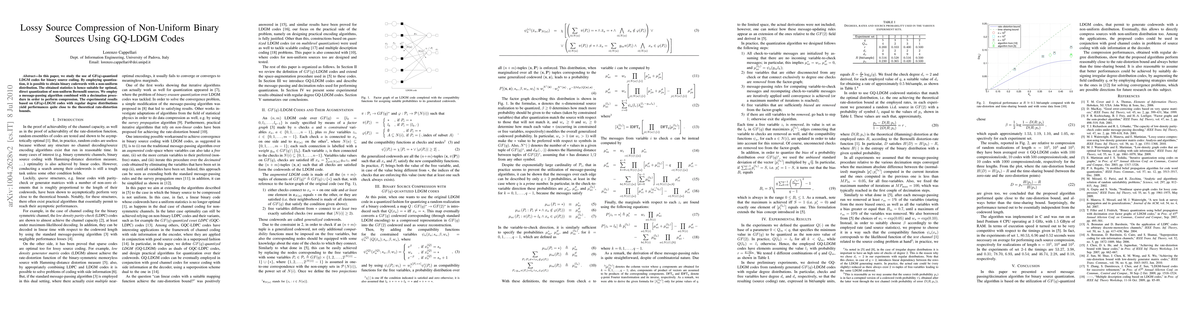 This paper explores the use of GF(q)-quantized LDGM codes for compressing non-uniform binary sources, achieving near-optimal performance through a message-passing algorithm and decimation procedure. Experimental results show that these codes perform close to theoretical rate-distortion bounds.