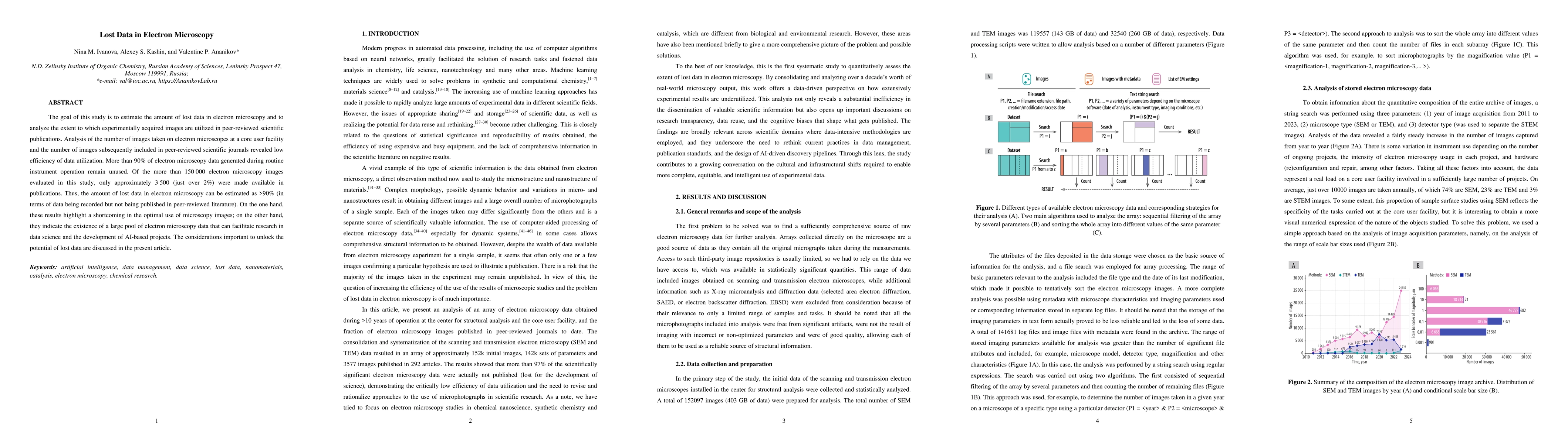 The goal of this study is to estimate the amount of lost data in electron microscopy and to analyze the extent to which experimentally acquired images are utilized in peer-reviewed scientific publications. Analysis of the number of images taken on electron microscopes at a core user facility and the number of images subsequently included in peer-reviewed scientific journals revealed low efficiency of data utilization. More than 90% of electron microscopy data generated during routine instrument operation remain unused. Of the more than 150000 electron microscopy images evaluated in this study, only approximately 3500 (just over 2%) were made available in publications. Thus, the amount of lost data in electron microscopy can be estimated as >90% (in terms of data being recorded but not being published in peer-reviewed literature). On the one hand, these results highlight a shortcoming in the optimal use of microscopy images; on the other hand, they indicate the existence of a large pool of electron microscopy data that can facilitate research in data science and the development of AI-based projects. The considerations important to unlock the potential of lost data are discussed in the present article.