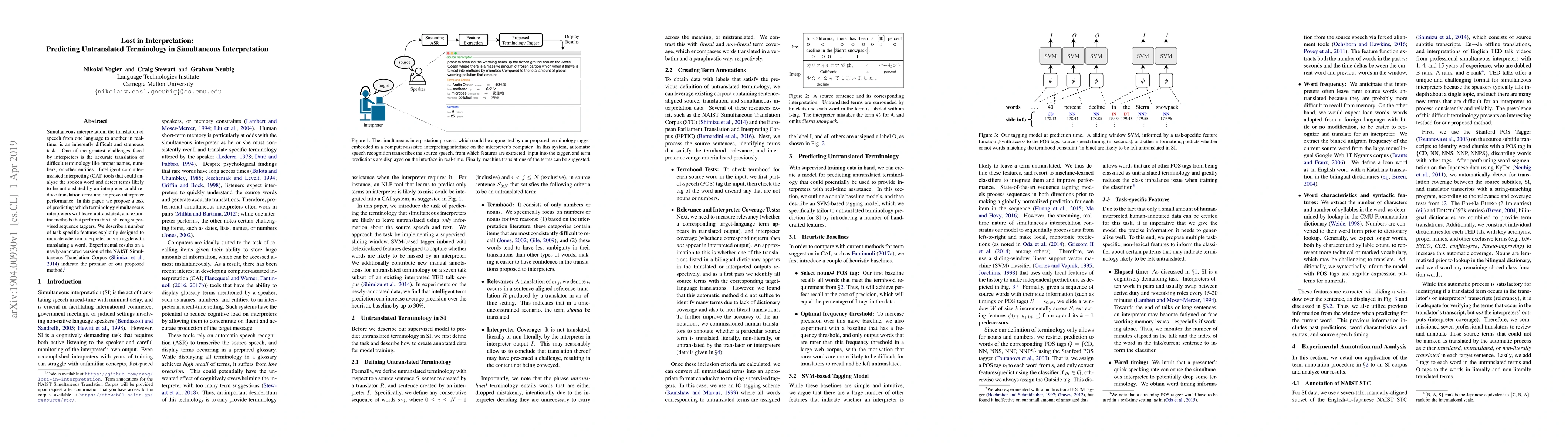 Simultaneous interpretation, the translation of speech from one language to another in real-time, is an inherently difficult and strenuous task. One of the greatest challenges faced by interpreters is the accurate translation of difficult terminology like proper names, numbers, or other entities. Intelligent computer-assisted interpreting (CAI) tools that could analyze the spoken word and detect terms likely to be untranslated by an interpreter could reduce translation error and improve interpreter performance. In this paper, we propose a task of predicting which terminology simultaneous interpreters will leave untranslated, and examine methods that perform this task using supervised sequence taggers. We describe a number of task-specific features explicitly designed to indicate when an interpreter may struggle with translating a word. Experimental results on a newly-annotated version of the NAIST Simultaneous Translation Corpus (Shimizu et al., 2014) indicate the promise of our proposed method.