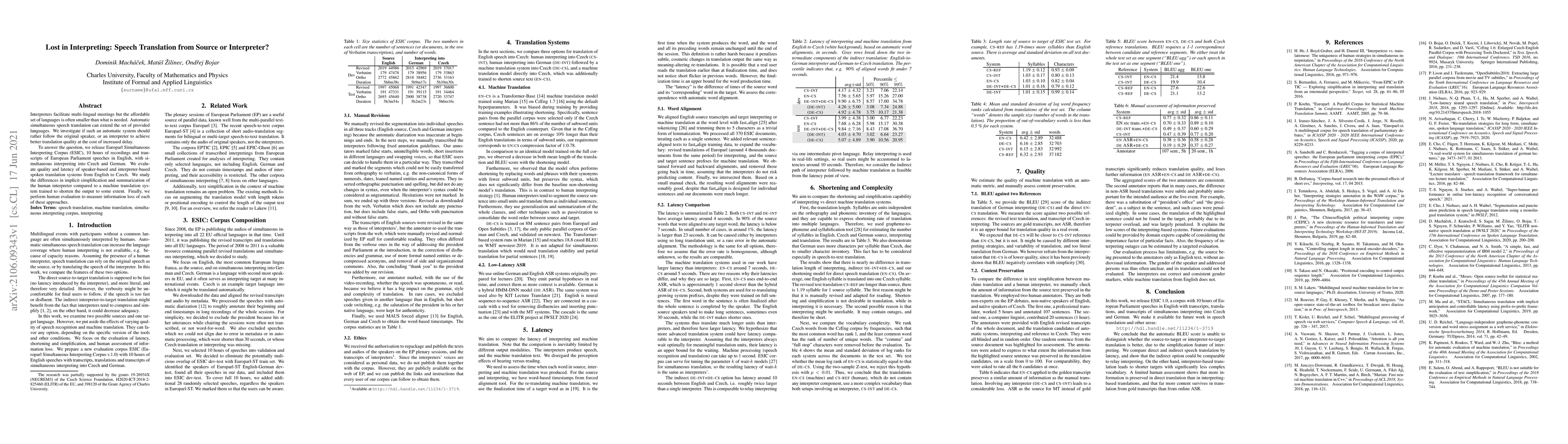 Interpreters facilitate multi-lingual meetings but the affordable set of languages is often smaller than what is needed. Automatic simultaneous speech translation can extend the set of provided languages. We investigate if such an automatic system should rather follow the original speaker, or an interpreter to achieve better translation quality at the cost of increased delay. To answer the question, we release Europarl Simultaneous Interpreting Corpus (ESIC), 10 hours of recordings and transcripts of European Parliament speeches in English, with simultaneous interpreting into Czech and German. We evaluate quality and latency of speaker-based and interpreter-based spoken translation systems from English to Czech. We study the differences in implicit simplification and summarization of the human interpreter compared to a machine translation system trained to shorten the output to some extent. Finally, we perform human evaluation to measure information loss of each of these approaches.