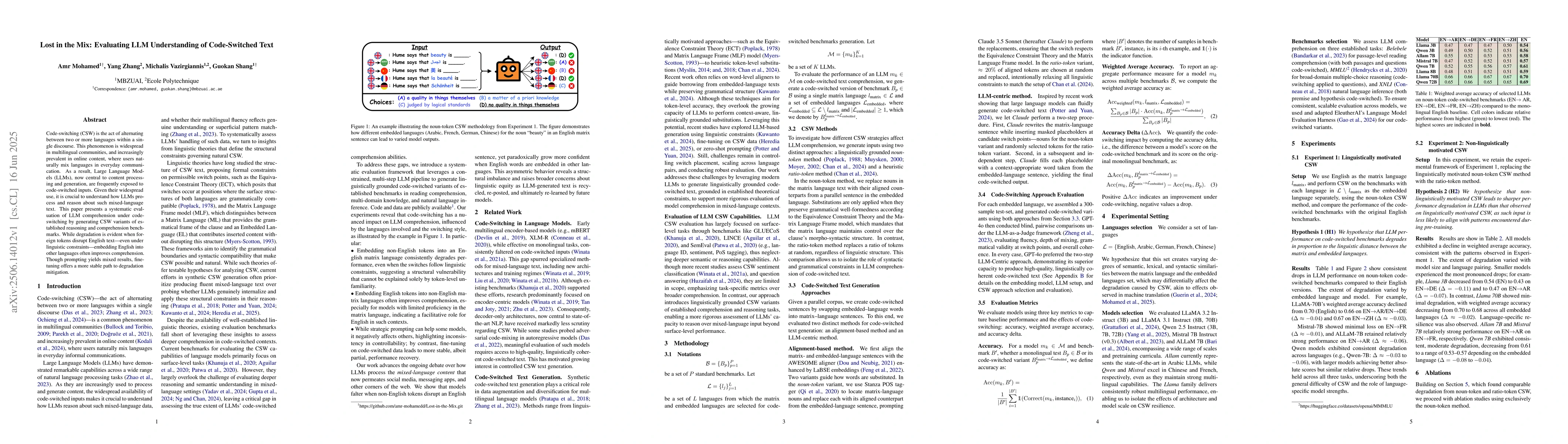 Code-switching (CSW) is the act of alternating between two or more languages within a single discourse. This phenomenon is widespread in multilingual communities, and increasingly prevalent in online content, where users naturally mix languages in everyday communication. As a result, Large Language Models (LLMs), now central to content processing and generation, are frequently exposed to code-switched inputs. Given their widespread use, it is crucial to understand how LLMs process and reason about such mixed-language text. This paper presents a systematic evaluation of LLM comprehension under code-switching by generating CSW variants of established reasoning and comprehension benchmarks. While degradation is evident when foreign tokens disrupt English text$\unicode{x2013}$even under linguistic constraints$\unicode{x2013}$embedding English into other languages often improves comprehension. Though prompting yields mixed results, fine-tuning offers a more stable path to degradation mitigation.
