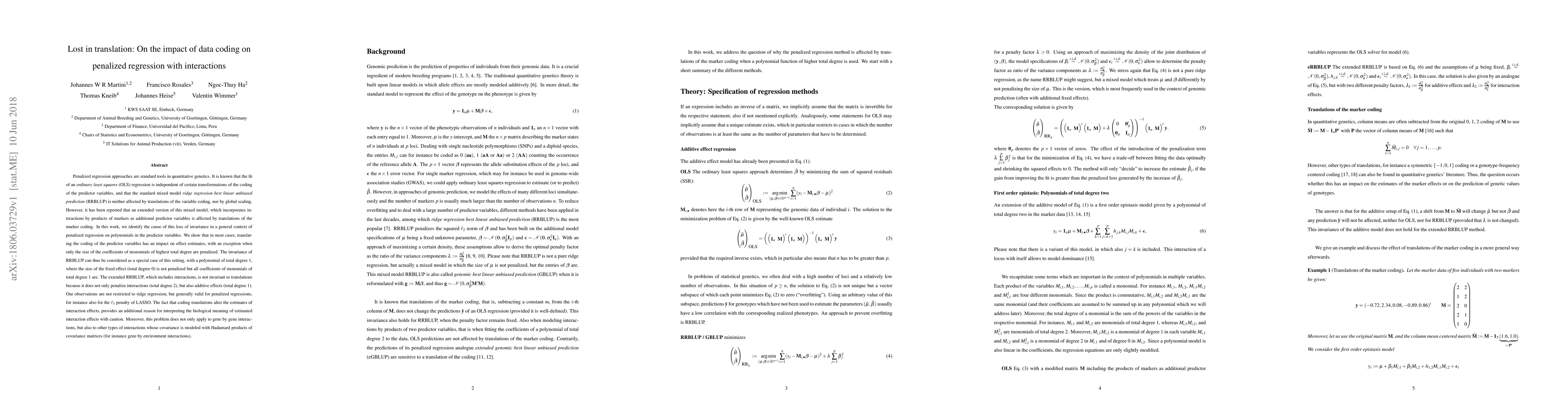 Penalized regression approaches are standard tools in quantitative genetics. It is known that the fit of an \emph{ordinary least squares} (OLS) regression is independent of certain transformations of the coding of the predictor variables, and that the standard mixed model \emph{ridge regression best linear unbiased prediction} (RRBLUP) is neither affected by translations of the variable coding, nor by global scaling. However, it has been reported that an extended version of this mixed model, which incorporates interactions by products of markers as additional predictor variables is affected by translations of the marker coding. In this work, we identify the cause of this loss of invariance in a general context of penalized regression on polynomials in the predictor variables. We show that in most cases, translating the coding of the predictor variables has an impact on effect estimates, with an exception when only the size of the coefficients of monomials of highest total degree are penalized. The invariance of RRBLUP can thus be considered as a special case of this setting, with a polynomial of total degree 1, where the size of the fixed effect (total degree 0) is not penalized but all coefficients of monomials of total degree 1 are. The extended RRBLUP, which includes interactions, is not invariant to translations because it does not only penalize interactions (total degree 2), but also additive effects (total degree 1). Our observations are not restricted to ridge regression, but generally valid for penalized regressions, for instance also for the $\ell_1$ penalty of LASSO.
