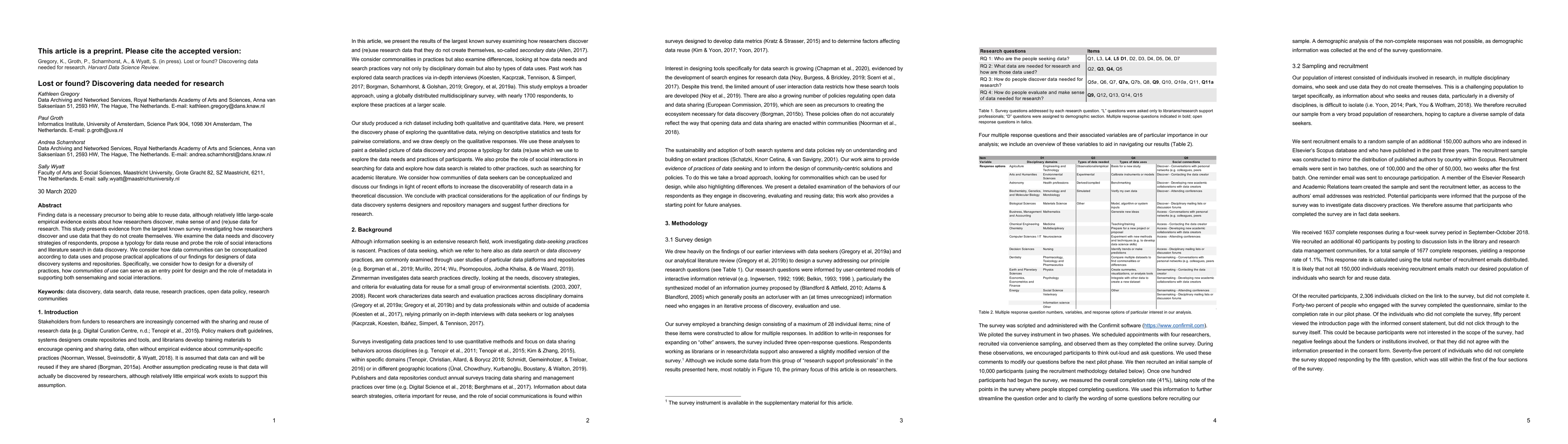 Finding data is a necessary precursor to being able to reuse data, although relatively little large-scale empirical evidence exists about how researchers discover, make sense of and (re)use data for research. This study presents evidence from the largest known survey investigating how researchers discover and use data that they do not create themselves. We examine the data needs and discovery strategies of respondents, propose a typology for data reuse and probe the role of social interactions and literature search in data discovery. We consider how data communities can be conceptualized according to data uses and propose practical applications of our findings for designers of data discovery systems and repositories. Specifically, we consider how to design for a diversity of practices, how communities of use can serve as an entry point for design and the role of metadata in supporting both sensemaking and social interactions.