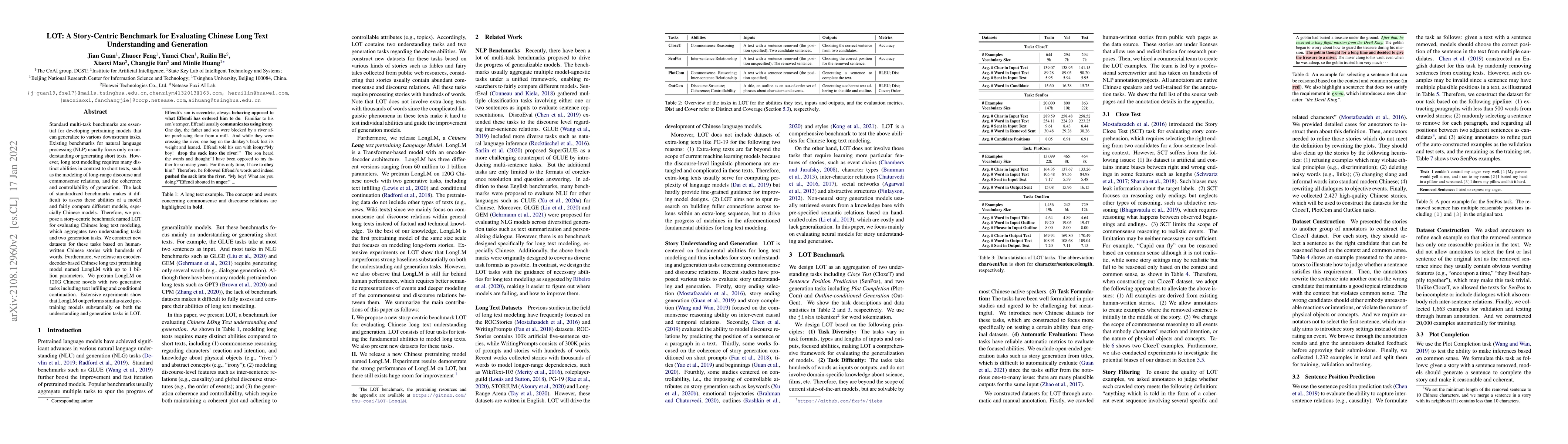This paper introduces LOT, a story-centric benchmark for evaluating Chinese long text understanding and generation, comprising datasets based on human-written Chinese stories. It also presents LongLM, a large pretraining model that significantly outperforms others in the benchmark tasks.