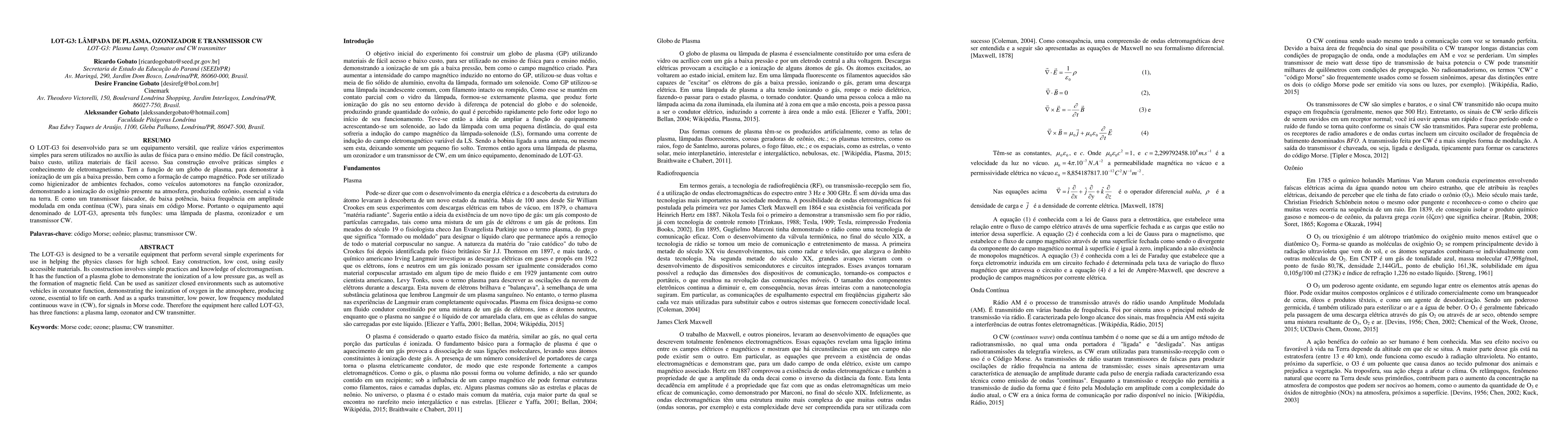 The LOT-G3 is designed to be a versatile equipment that perform several simple experiments for use in helping the physics classes for high school. Easy construction, low cost, using easily accessible materials. Its construction involves simple practices and knowledge of electromagnetism. It has the function of a plasma globe to demonstrate the ionization of a low pressure gas, as well as the formation of magnetic field. Can be used as sanitizer closed environments such as automotive vehicles in ozonator function, demonstrating the ionization of oxygen in the atmosphere, producing ozone, essential to life on earth. And as a sparks transmitter, low power, low frequency modulated continuous wave in (CW), for signals in Morse code. Therefore the equipment here called LOT-G3, has three functions: a plasma lamp, ozonator and CW transmitter.