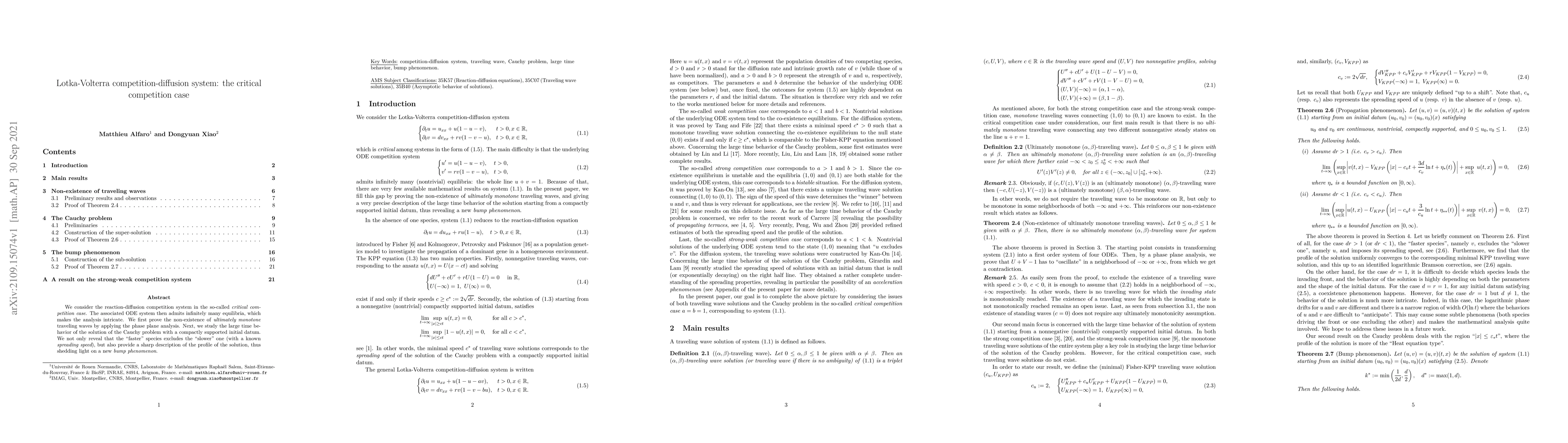 We consider the reaction-diffusion competition system in the so-called {\it critical competition case}. The associated ODE system then admits infinitely many equilibria, which makes the analysis intricate. We first prove the non-existence of {\it ultimately monotone} traveling waves by applying the phase plane analysis. Next, we study the large time behavior of the solution of the Cauchy problem with a compactly supported initial datum. We not only reveal that the "faster" species excludes the "slower" one (with a known {\it spreading speed}), but also provide a sharp description of the profile of the solution, thus shedding light on a new {\it{bump phenomenon}}.