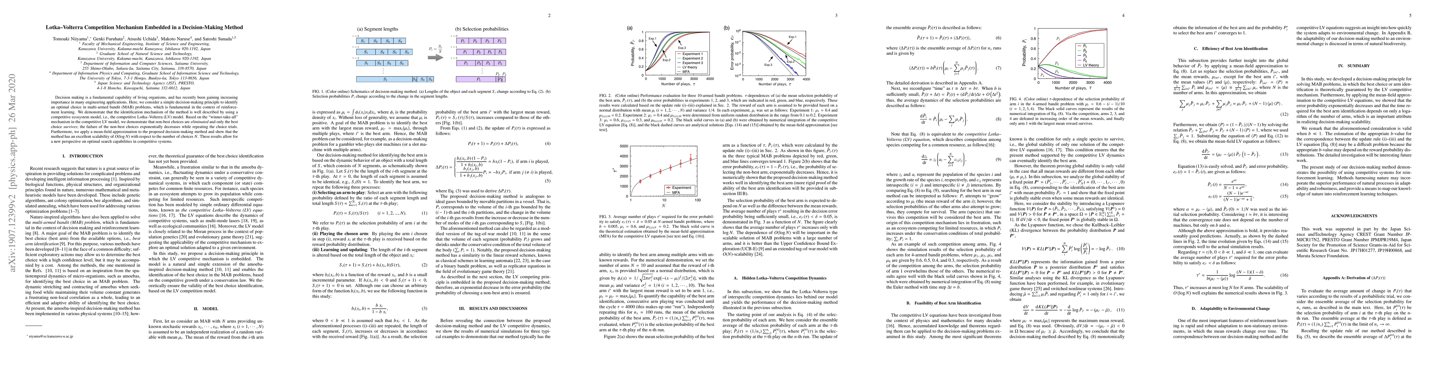 This research applies the Lotka-Volterra competition model to decision-making in multi-armed bandit problems, demonstrating that suboptimal choices are eliminated over time, leaving only the best choice. The method scales logarithmically with the number of choices, offering new insights into optimal search in competitive systems.