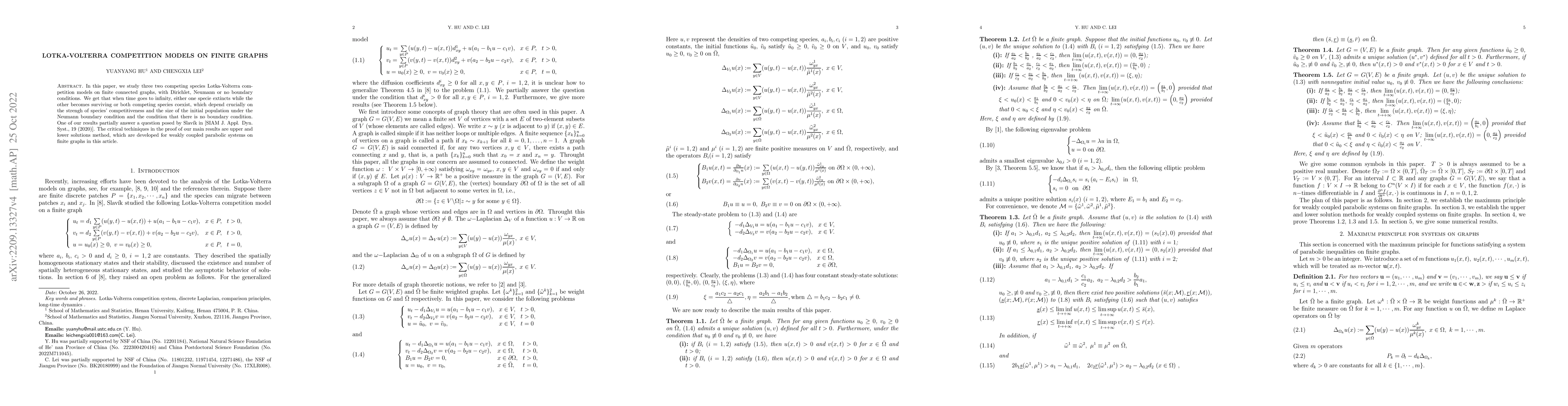 This paper investigates three Lotka-Volterra competition models for two competing species on finite graphs, under different boundary conditions. The study reveals that species outcomes depend on competitiveness and initial population size, leading to either extinction or coexistence, and partially answers a question posed by Slavík. The proof employs upper and lower solutions methods developed for weakly coupled parabolic systems on finite graphs.