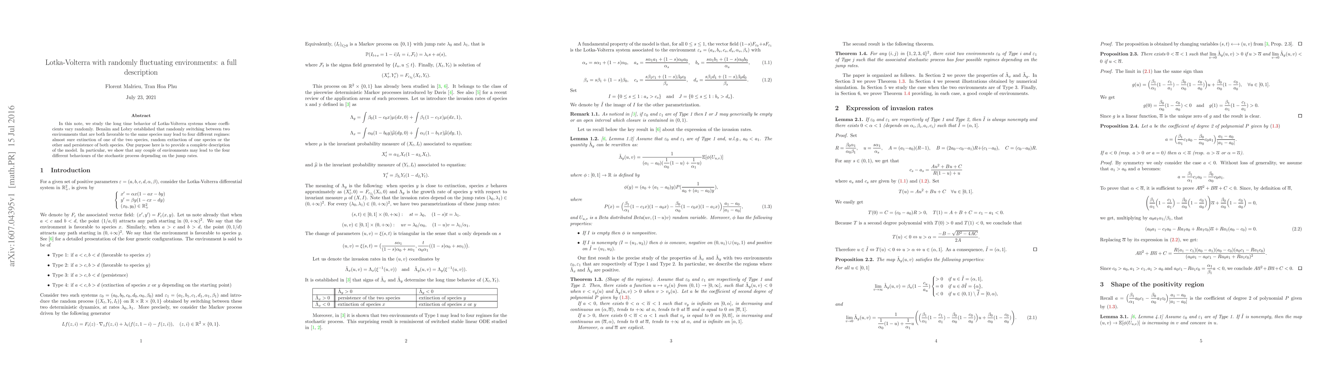 In this note, we study the long time behavior of Lotka-Volterra systems whose coefficients vary randomly. Benam and Lobry established that randomly switching between two environments that are both favorable to the same species may lead to four different regimes: almost sure extinction of one of the two species, random extinction of one species or the other and persistence of both species. Our purpose here is to provide a complete description of the model. In particular, we show that any couple of environments may lead to the four different behaviours of the stochastic process depending on the jump rates.