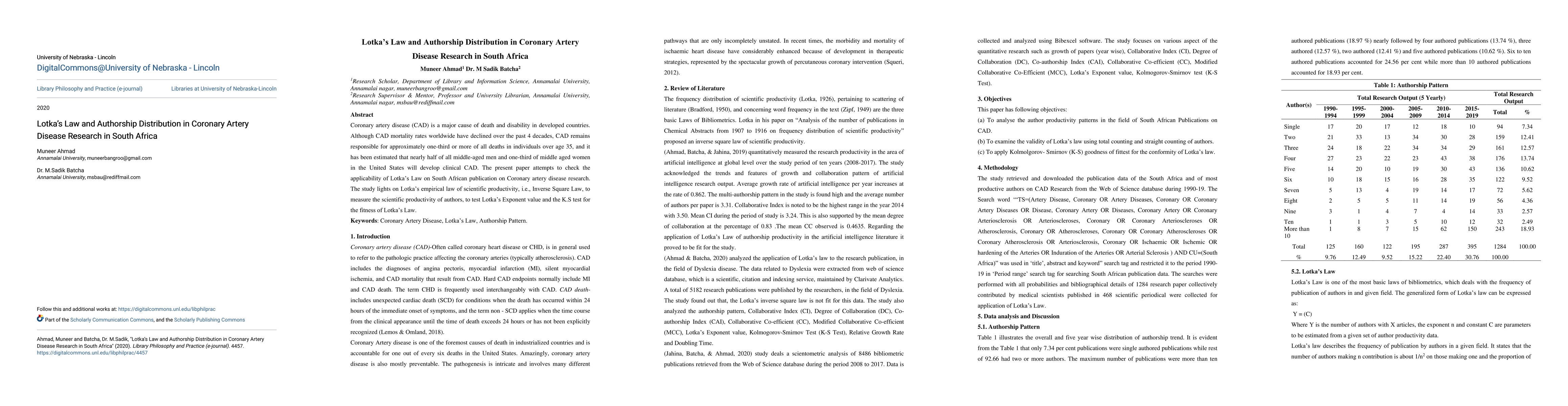 This paper examines the applicability of Lotka's Law to authorship distribution in coronary artery disease research publications in South Africa, using the inverse square law to measure scientific productivity and testing the law's exponent value and fitness through the K.S test.