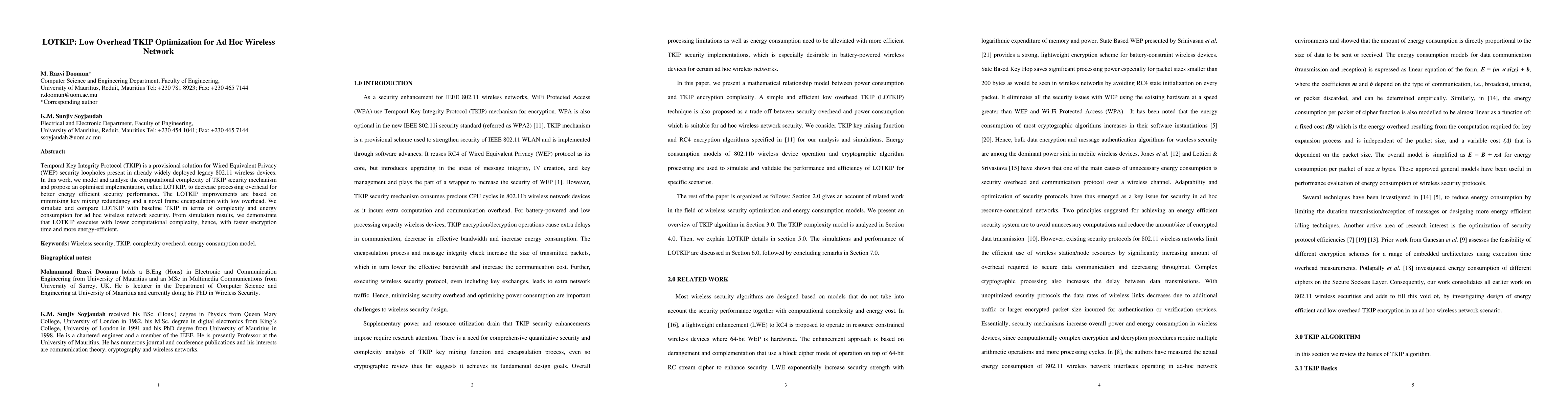 This research introduces LOTKIP, an optimized version of TKIP for legacy wireless devices, reducing computational complexity and energy consumption by minimizing key mixing redundancy and using low-overhead frame encapsulation. Simulations show LOTKIP outperforms TKIP in terms of faster encryption and energy efficiency.