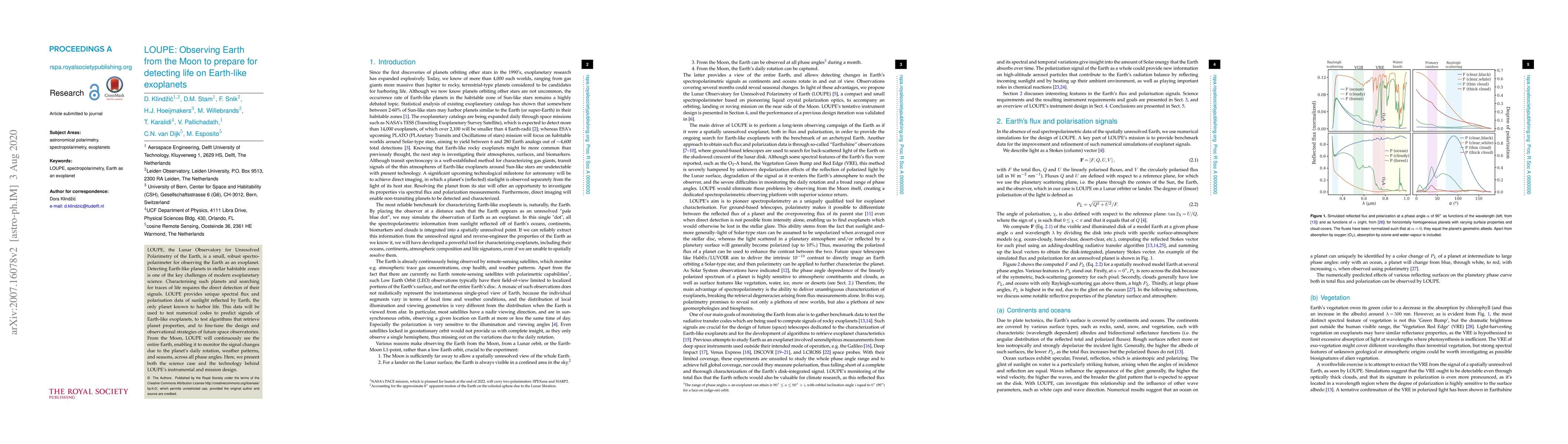 LOUPE is a lunar-based spectro-polarimeter designed to observe Earth as an exoplanet, aiming to characterize Earth-like planets and detect potential life signals. The mission will provide data to refine algorithms for future exoplanet observations and test observational strategies for space observatories.