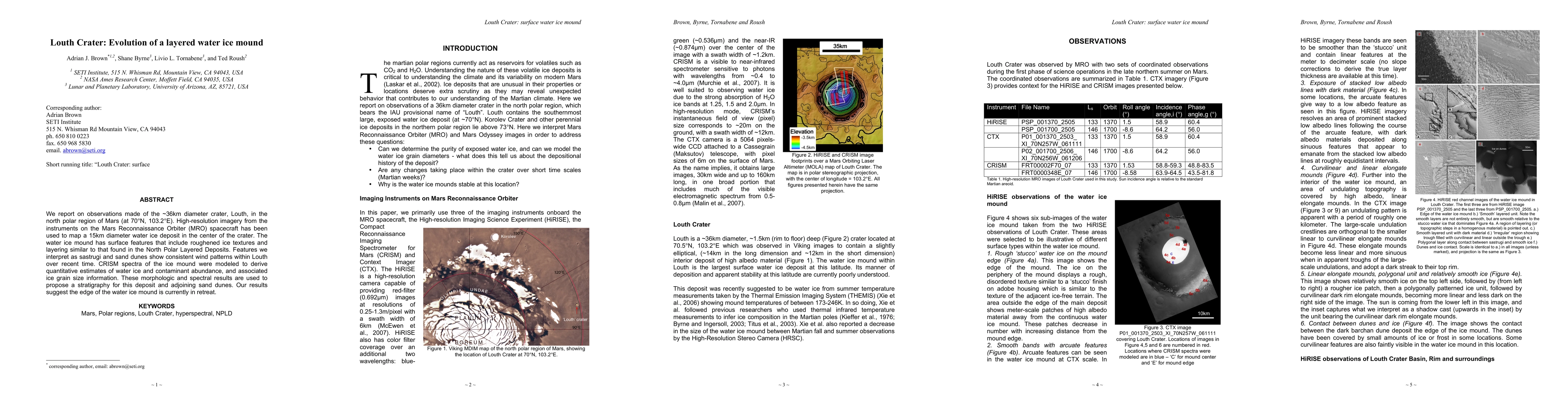 High-resolution imagery from Mars Reconnaissance Orbiter (MRO) instruments, including HiRISE, CTX, and CRISM, was used to map and analyze the water ice deposit in Louth Crater, north polar region of Mars.