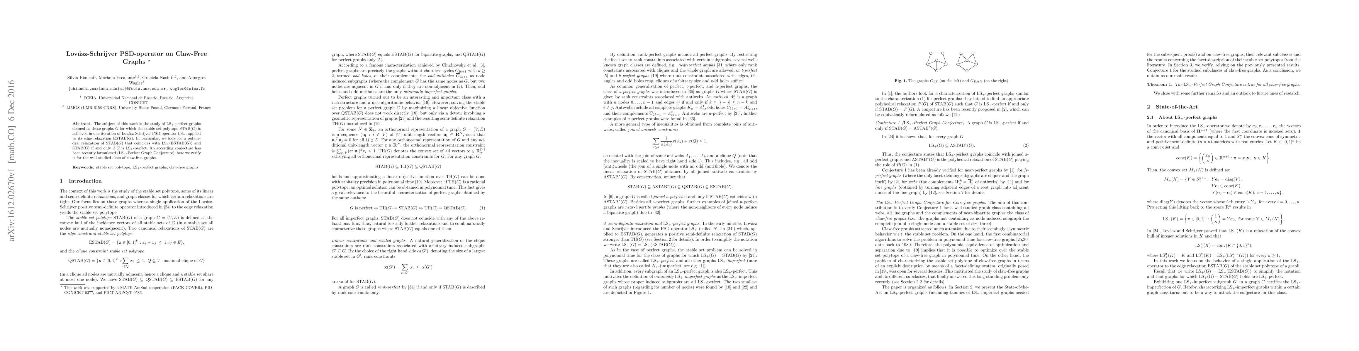 The subject of this work is the study of $\LS_+$-perfect graphs defined as those graphs $G$ for which the stable set polytope $\stab(G)$ is achieved in one iteration of Lov\'asz-Schrijver PSD-operator $\LS_+$, applied to its edge relaxation $\estab(G)$. In particular, we look for a polyhedral relaxation of $\stab(G)$ that coincides with $\LS_+(\estab(G))$ and $\stab(G)$ if and only if $G$ is $\LS_+$-perfect. An according conjecture has been recently formulated ($\LS_+$-Perfect Graph Conjecture); here we verify it for the well-studied class of claw-free graphs.