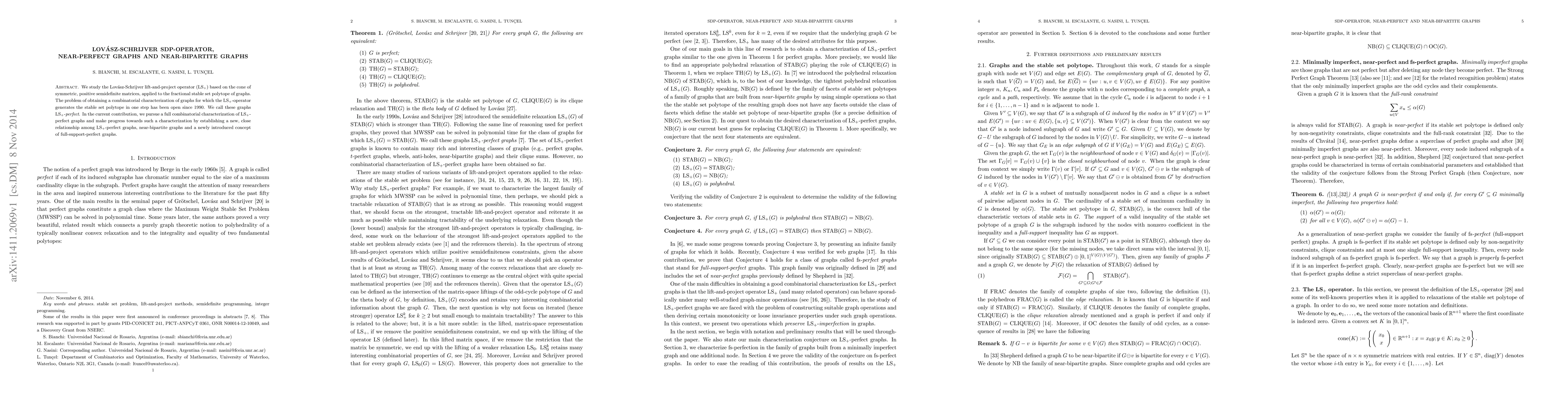 We study the Lov\'asz-Schrijver lift-and-project operator ($LS_+$) based on the cone of symmetric, positive semidefinite matrices, applied to the fractional stable set polytope of graphs. The problem of obtaining a combinatorial characterization of graphs for which the $LS_+$-operator generates the stable set polytope in one step has been open since 1990. We call these graphs $LS_+$-perfect. In the current contribution, we pursue a full combinatorial characterization of $LS_+$-perfect graphs and make progress towards such a characterization by establishing a new, close relationship among $LS_+$-perfect graphs, near-bipartite graphs and a newly introduced concept of full-support-perfect graphs.