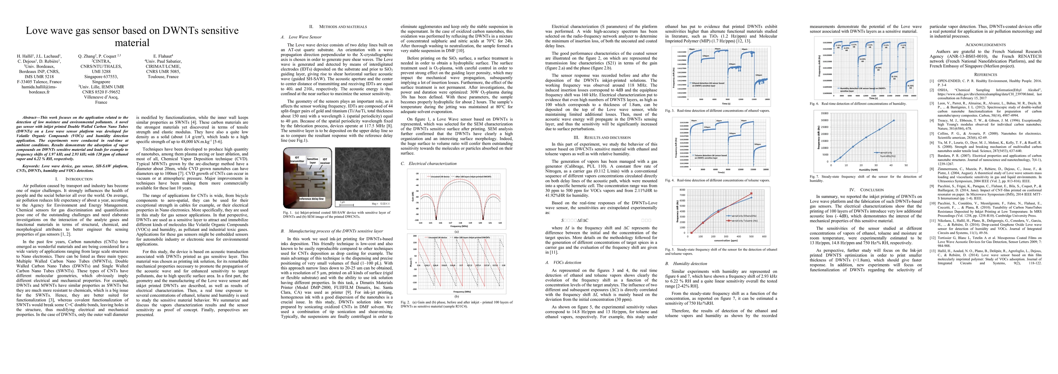 This paper presents a novel Love wave gas sensor utilizing inkjet-printed Double Walled Carbon Nano Tubes (DWNTs) for detecting Volatile Organic Compounds (VOCs) and humidity. Experimental results show significant frequency shifts in response to ethanol vapor and humidity, indicating effective detection capabilities.