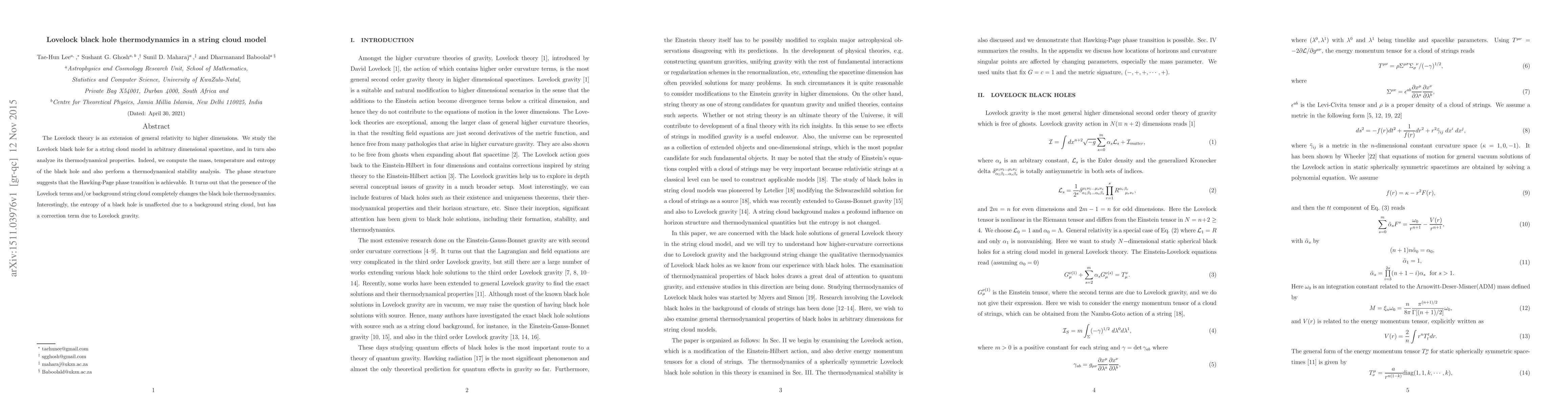 The Lovelock theory is an extension of general relativity to higher dimensions. We study the Lovelock black hole for a string cloud model in arbitrary dimensional spacetime, and in turn also analyze its thermodynamical properties. Indeed, we compute the mass, temperature and entropy of the black hole and also perform a thermodynamical stability analysis. The phase structure suggests that the Hawking-Page phase transition is achievable. It turns out that the presence of the Lovelock terms and/or background string cloud completely changes the black hole thermodynamics. Interestingly, the entropy of a black hole is unaffected due to a background string cloud, but has a correction term due to Lovelock gravity.