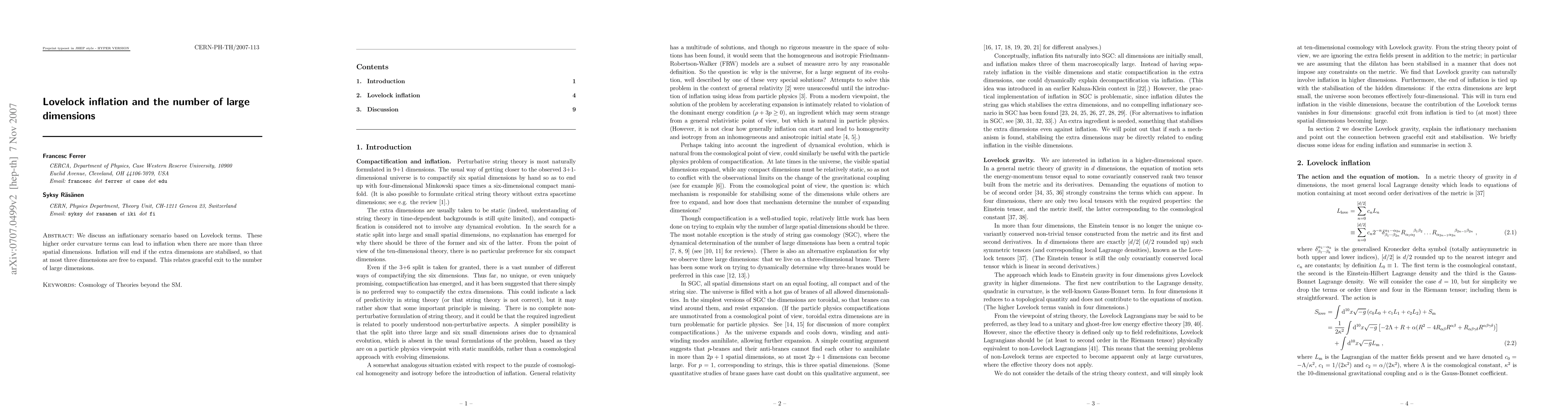 The paper explores an inflationary model based on Lovelock terms, which are higher-order curvature terms enabling inflation with more than three spatial dimensions. Inflation concludes when extra dimensions are stabilized, linking graceful exit to the number of large dimensions.