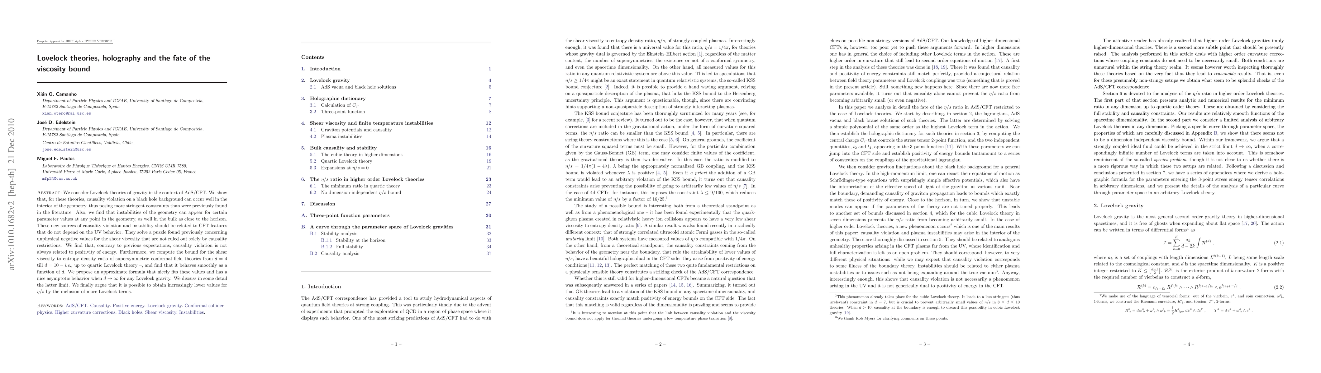 We consider Lovelock theories of gravity in the context of AdS/CFT. We show that, for these theories, causality violation on a black hole background can occur well in the interior of the geometry, thus posing more stringent constraints than were previously found in the literature. Also, we find that instabilities of the geometry can appear for certain parameter values at any point in the geometry, as well in the bulk as close to the horizon. These new sources of causality violation and instability should be related to CFT features that do not depend on the UV behavior. They solve a puzzle found previously concerning unphysical negative values for the shear viscosity that are not ruled out solely by causality restrictions. We find that, contrary to previous expectations, causality violation is not always related to positivity of energy. Furthermore, we compute the bound for the shear viscosity to entropy density ratio of supersymmetric conformal field theories from d=4 till d=10 - i.e., up to quartic Lovelock theory -, and find that it behaves smoothly as a function of d. We propose an approximate formula that nicely fits these values and has a nice asymptotic behavior when d goes to infinity for any Lovelock gravity. We discuss in some detail the latter limit. We finally argue that it is possible to obtain increasingly lower values for the shear viscosity to entropy density ratio by the inclusion of more Lovelock terms.