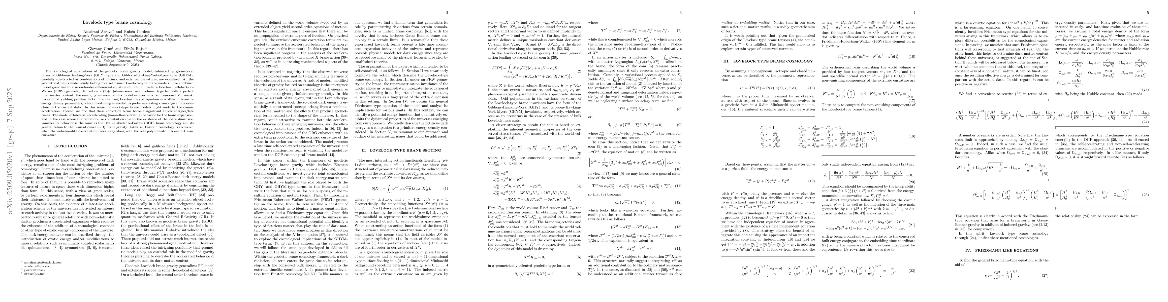 The cosmological implications of the geodetic brane gravity model, enhanced by geometrical terms of Gibbons-Hawking-York (GHY) type and Gibbons-Hawking-York-Myers type (GHYM), carefully constructed as combinations of intrinsic and extrinsic curvatures, are examined. All the geometrical terms under study belong to a set named Lovelock-type brane models. The combined model gives rise to a second-order differential equation of motion. Under a Friedmann-Robertson-Walker (FRW) geometry defined on a $(3+1)$-dimensional world volume, together with a perfect fluid matter content, the emerging universe of this model evolves in a 5-dimensional Minkowski background, yielding peculiar facts. The resulting Friedmann-type equation is written in terms of energy density parameters, where fine-tuning is needed to probe interesting cosmological processes close to the current data. In this sense, Lovelock-type brane models might underlie the cosmic acceleration. Indeed, we find that these correction terms become significant at low energies/late times. The model exhibits self-accelerating (non-self-accelerating) behavior for the brane expansion, and in the case where the radiation-like contribution due to the existence of the extra dimension vanishes its behavior is the same as the Dvali-Gabadadze-Porrati (DGP) brane cosmology and its generalization to the Gauss-Bonnet (GB) brane gravity. Likewise, Einstein cosmology is recovered when the radiation-like contribution fades away along with the odd polynomials in brane extrinsic curvature.