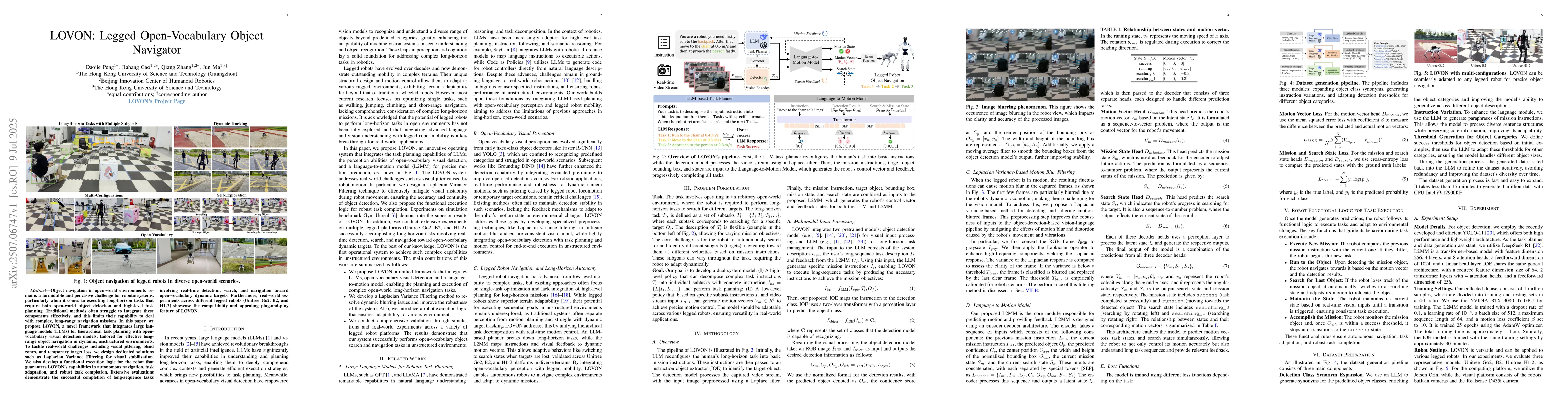 Object navigation in open-world environments remains a formidable and pervasive challenge for robotic systems, particularly when it comes to executing long-horizon tasks that require both open-world object detection and high-level task planning. Traditional methods often struggle to integrate these components effectively, and this limits their capability to deal with complex, long-range navigation missions. In this paper, we propose LOVON, a novel framework that integrates large language models (LLMs) for hierarchical task planning with open-vocabulary visual detection models, tailored for effective long-range object navigation in dynamic, unstructured environments. To tackle real-world challenges including visual jittering, blind zones, and temporary target loss, we design dedicated solutions such as Laplacian Variance Filtering for visual stabilization. We also develop a functional execution logic for the robot that guarantees LOVON's capabilities in autonomous navigation, task adaptation, and robust task completion. Extensive evaluations demonstrate the successful completion of long-sequence tasks involving real-time detection, search, and navigation toward open-vocabulary dynamic targets. Furthermore, real-world experiments across different legged robots (Unitree Go2, B2, and H1-2) showcase the compatibility and appealing plug-and-play feature of LOVON.