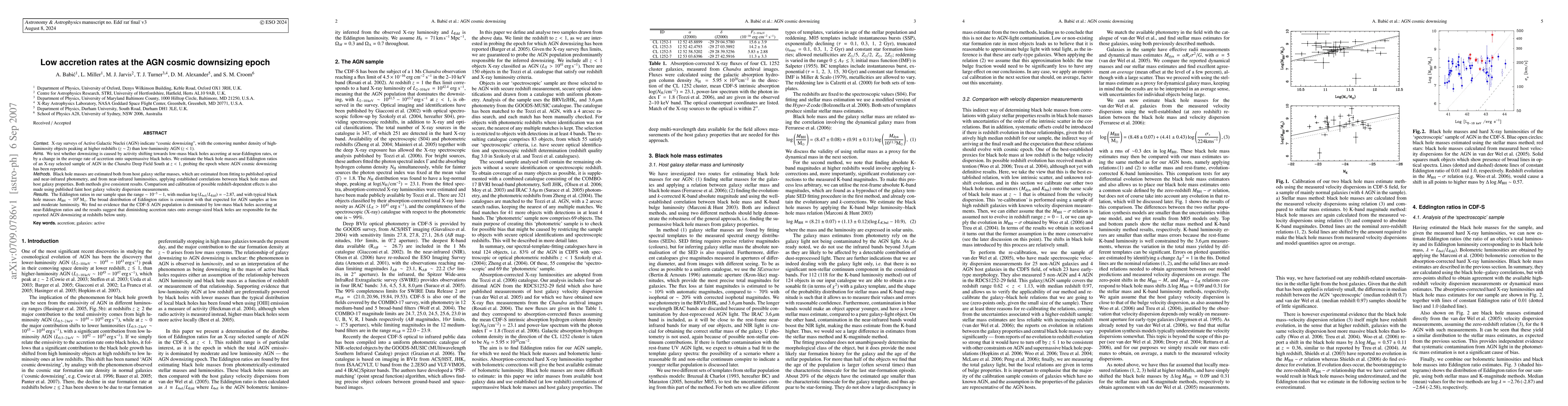 This paper investigates the accretion rates of AGN during the cosmic downsizing epoch, finding low accretion rates across a broad range of black hole masses. The study concludes that the observed downsizing trend is not due to a shift towards low-mass black holes accreting near Eddington limits, but rather due to reduced accretion rates on average-sized black holes.