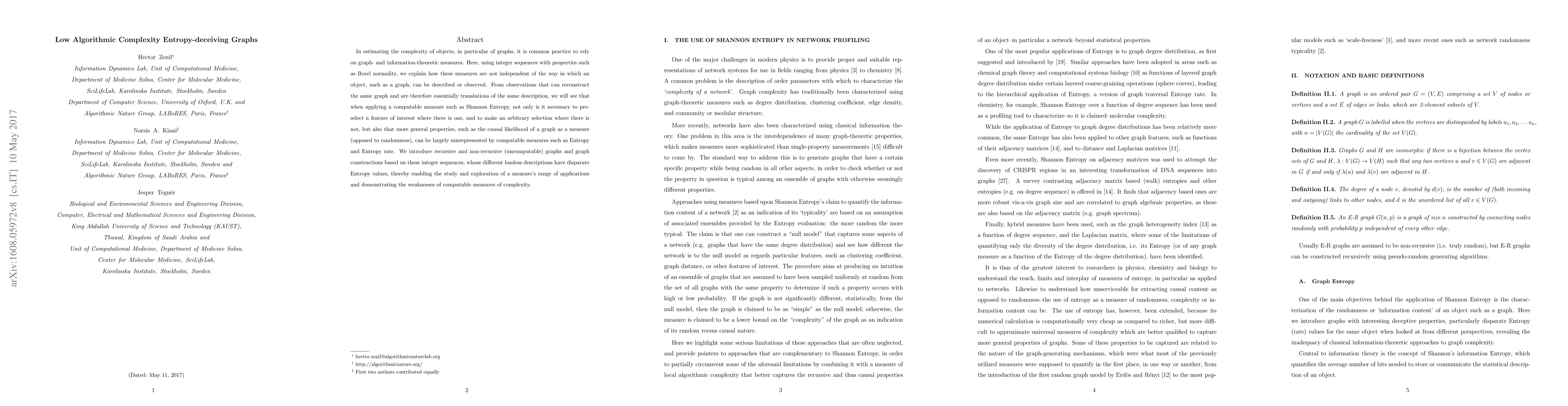 In estimating the complexity of objects, in particular of graphs, it is common practice to rely on graph- and information-theoretic measures. Here, using integer sequences with properties such as Borel normality, we explain how these measures are not independent of the way in which an object, such as a graph, can be described or observed. From observations that can reconstruct the same graph and are therefore essentially translations of the same description, we will see that when applying a computable measure such as Shannon Entropy, not only is it necessary to pre-select a feature of interest where there is one, and to make an arbitrary selection where there is not, but also that more general properties, such as the causal likelihood of a graph as a measure (opposed to randomness), can be largely misrepresented by computable measures such as Entropy and Entropy rate. We introduce recursive and non-recursive (uncomputable) graphs and graph constructions based on these integer sequences, whose different lossless descriptions have disparate Entropy values, thereby enabling the study and exploration of a measure's range of applications and demonstrating the weaknesses of computable measures of complexity.