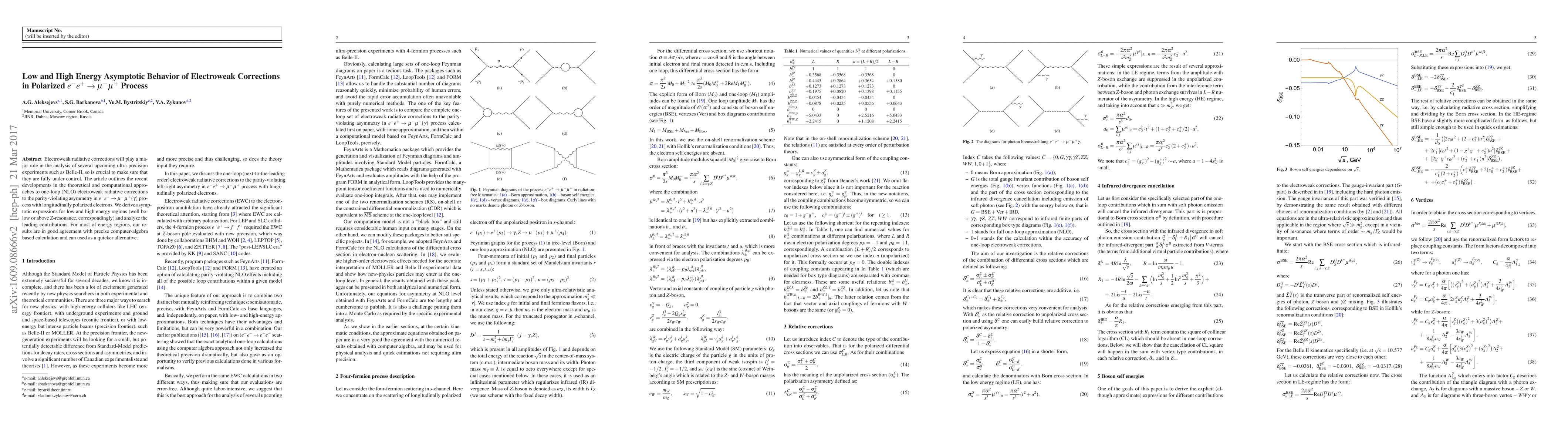 This paper investigates one-loop electroweak corrections for the polarized $e^+ e^- \to \mu^+ \mu^-$ process, deriving asymptotic expressions for both low and high energy regions. The results provide a quicker alternative to precise computer-algebra calculations, crucial for upcoming ultra-precision experiments.