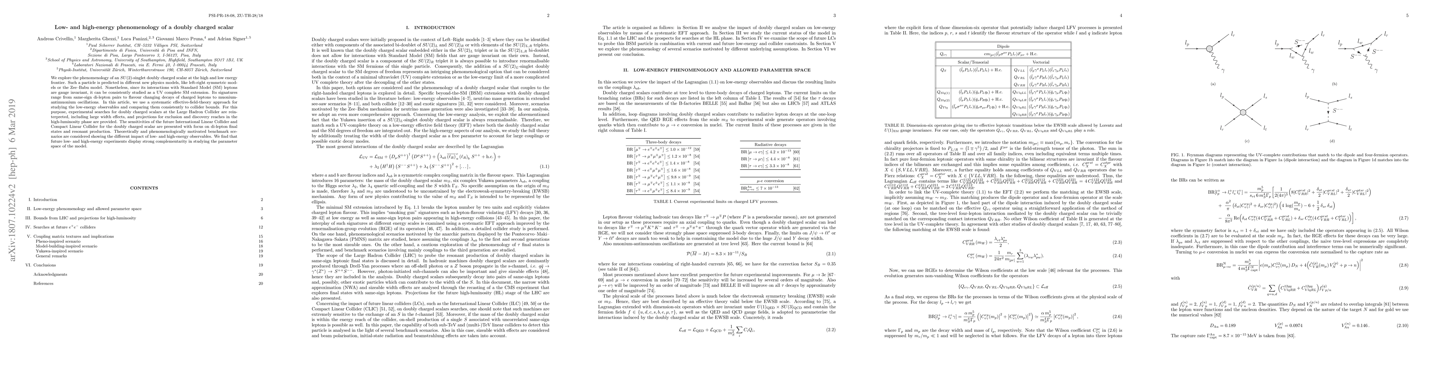 This paper investigates the phenomenology of a doubly charged scalar predicted in new physics models, analyzing its signatures across low- and high-energy experiments. It uses an effective-field-theory approach to study low-energy observables and reinterprets collider searches, while also projecting future collider results, highlighting the complementary nature of low- and high-energy experiments in exploring the model's parameter space.