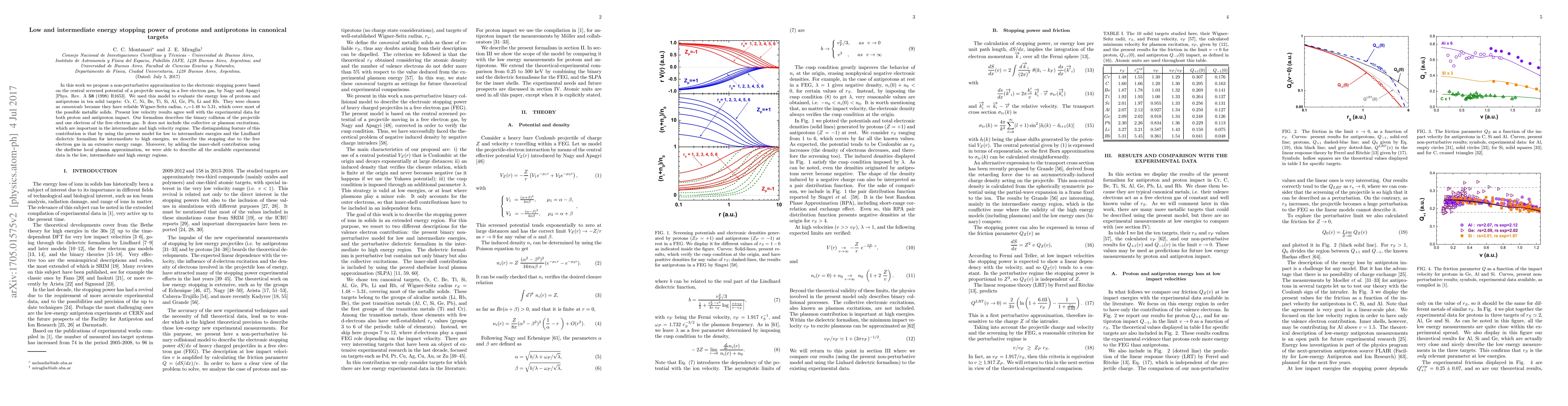 In this work we propose a non-perturbative approximation to the electronic stopping power based on the central screened potential of a projectile moving in a free electron gas, by Nagy and Apagyi. We used this model to evaluate the energy loss of protons and antiprotons in ten solid targets: Cr, C, Ni, Be, Ti, Si, Al, Ge, Pb, Li and Rb. They were chosen as canonicals because they have reliable values of the Seitz radio, rS=1.48-5.31 a.u., which cover most of the possible metallic solids. Present low velocity results agree well with the experimental data for both proton and antiproton impact. Our formalism describes the binary collision of the projectile and one electron of the free electron gas. It does not include the collective or plasmon excitations, which are important in the intermediate to high velocity regime. The distinguishing feature of this contribution is that by using the present model for low to intermediate energies (below the appearance of plasmon excitations), the Lindhard dielectric formalism (including plasmons) for intermediate to high energies, and the shellwise local plasma approximation to account for the inner shell contribution, then a good full-theoretical description of the available experimental data is obtained in an extensive energy range, covering the low, intermediate and high energy region.
