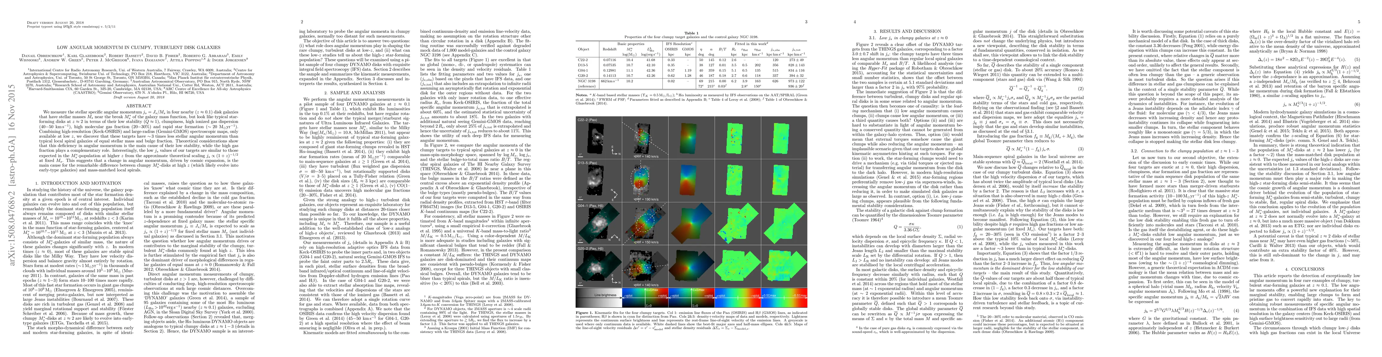 We measure the stellar specific angular momentum jstar=Jstar/Mstar in four nearby (z~0.1) disk galaxies that have stellar masses Mstar near the break M* of the galaxy mass function, but look like typical star-forming disks at z~2 in terms of their low stability (Q~1), clumpiness, high ionized gas dispersion (40-50 km/s), high molecular gas fraction (20-30%) and rapid star formation (~20 Msun/yr). Combining high-resolution (Keck-OSIRIS) and large-radius (Gemini-GMOS) spectroscopic maps, only available at low z, we discover that these targets have about three times less stellar angular momentum than typical local spiral galaxies of equal stellar mass and bulge fraction. Theoretical considerations show that this deficiency in angular momentum is the main cause of their low stability, while the high gas fraction plays a complementary role. Interestingly, the low jstar values of our targets are similar to those expected in the M*-population at higher z from the approximate theoretical scaling jstar~(1+z)^(-1/2) at fixed Mstar. This suggests that a change in angular momentum, driven by cosmic expansion, is the main cause for the remarkable difference between clumpy M*-disks at high z (which likely evolve into early-type galaxies) and mass-matched local spirals.