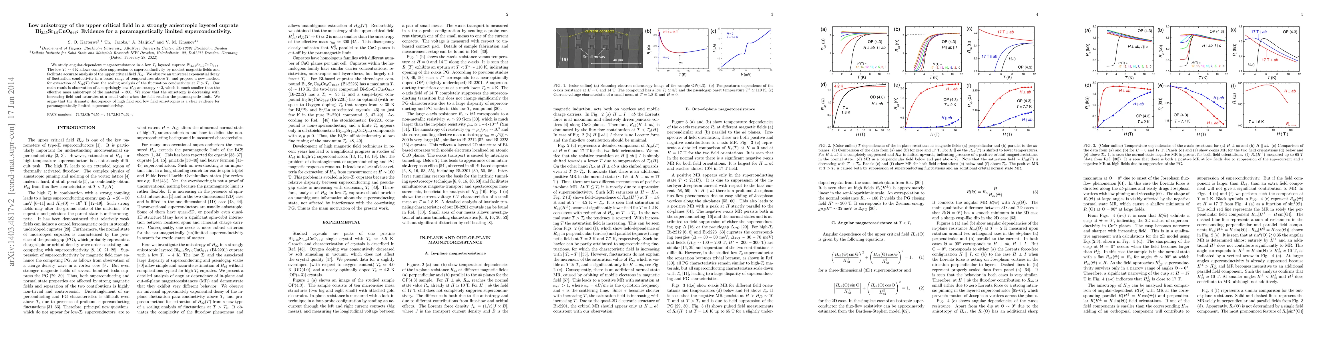 This paper investigates angular-dependent magnetoresistance in a low-temperature layered cuprate, revealing a low upper critical field anisotropy of ~2, much smaller than expected. The study suggests that superconductivity is limited by paramagnetic effects, evidenced by the decreasing anisotropy with increasing magnetic field.