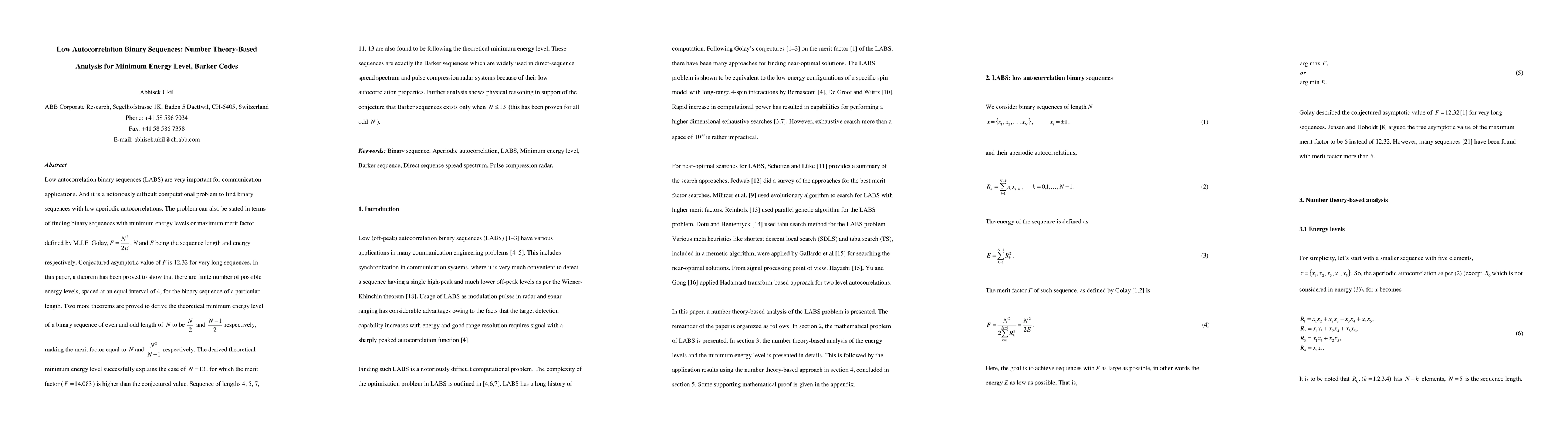 This paper explores low autocorrelation binary sequences (LABS) crucial for communication applications, proving theorems that establish finite energy levels for sequences of specific lengths. The theoretical minimum energy levels for even and odd lengths are derived, explaining Barker sequences' merit factor and supporting the conjecture that Barker sequences exist only for lengths up to 13.