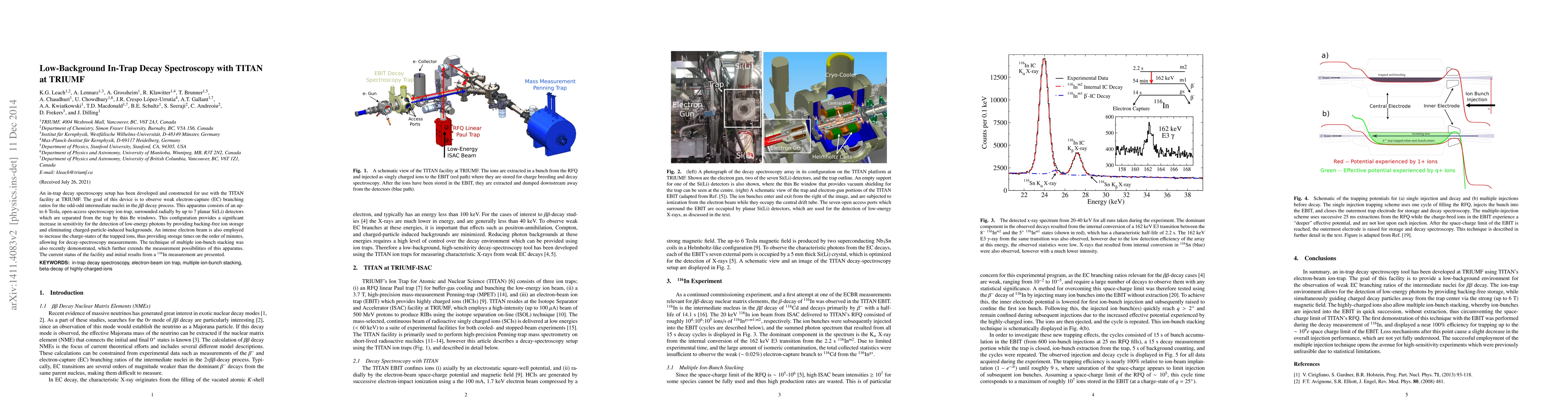 An in-trap decay spectroscopy setup has been developed and constructed for use with the TITAN facility at TRIUMF. The goal of this device is to observe weak electron-capture (EC) branching ratios for the odd-odd intermediate nuclei in the $\beta\beta$ decay process. This apparatus consists of an up-to 6 Tesla, open-access spectroscopy ion-trap, surrounded radially by up to 7 planar Si(Li) detectors which are separated from the trap by thin Be windows. This configuration provides a significant increase in sensitivity for the detection of low-energy photons by providing backing-free ion storage and eliminating charged-particle-induced backgrounds. An intense electron beam is also employed to increase the charge-states of the trapped ions, thus providing storage times on the order of minutes, allowing for decay-spectroscopy measurements. The technique of multiple ion-bunch stacking was also recently demonstrated, which further extends the measurement possibilities of this apparatus. The current status of the facility and initial results from a $^{116}$In measurement are presented.