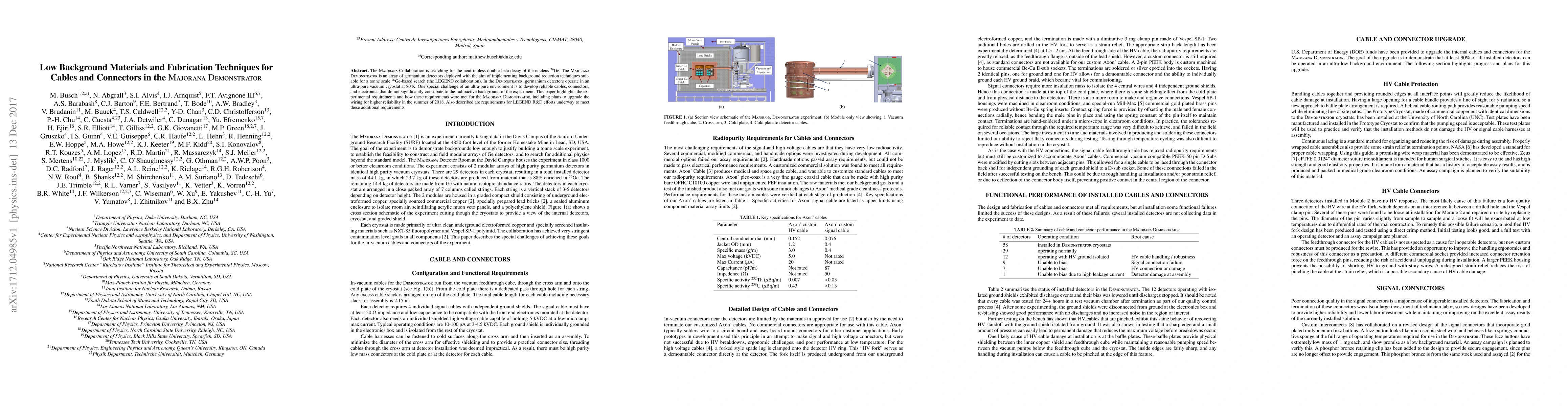 The MAJORANA DEMONSTRATOR aims to detect neutrinoless double-beta decay using germanium detectors, requiring low background materials and fabrication techniques for cables and connectors to minimize radioactive background. Efforts to upgrade wiring and meet LEGEND collaboration standards are also discussed.