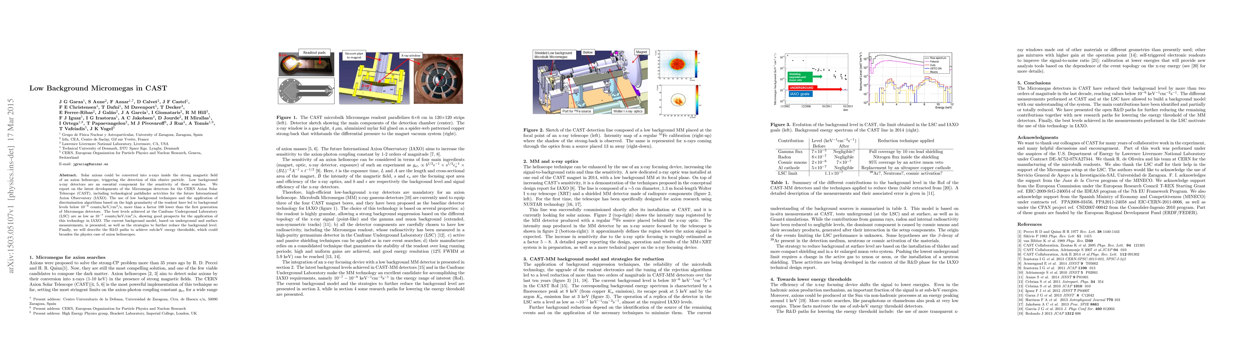 This paper reports on advancements in low background Micromegas detectors for the CERN Axion Solar Telescope (CAST), achieving background levels below 10$^{-6}$ counts/keV/cm$^2$/s, and discusses their potential application in the future International Axion Observatory (IAXO). The best background levels reached are as low as 10$^{-7}$ counts/keV/cm$^2$/s, demonstrating significant improvements over previous generations.
