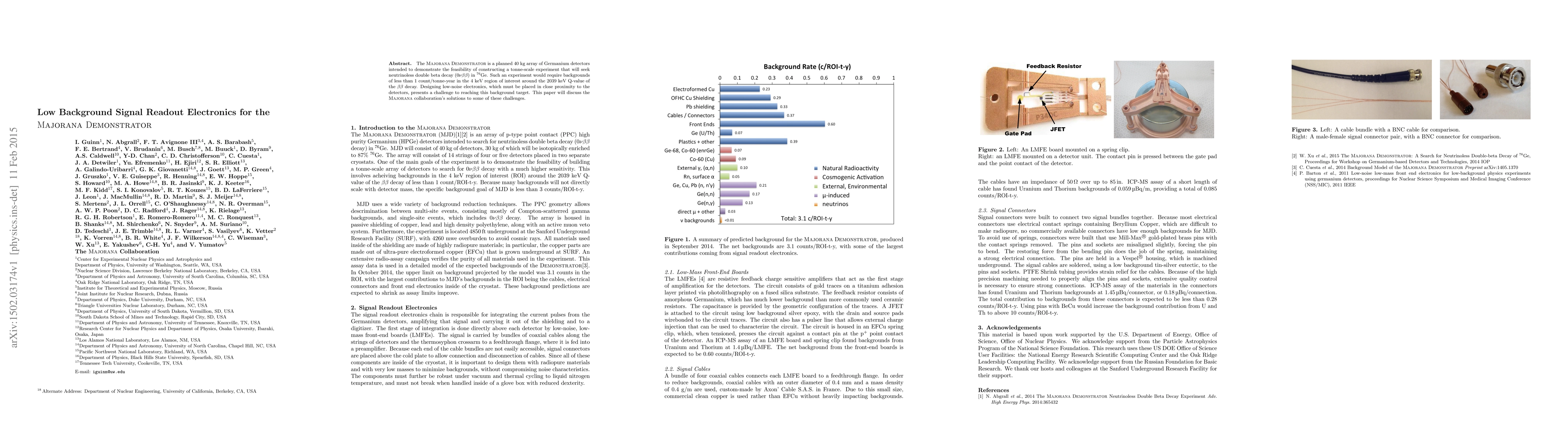The MAJORANA DEMONSTRATOR aims to detect neutrinoless double beta decay in Germanium, requiring extremely low background noise. The paper details the collaboration's innovative low-background signal readout electronics designed to achieve less than 1 count/tonne-year in the 4 keV region.